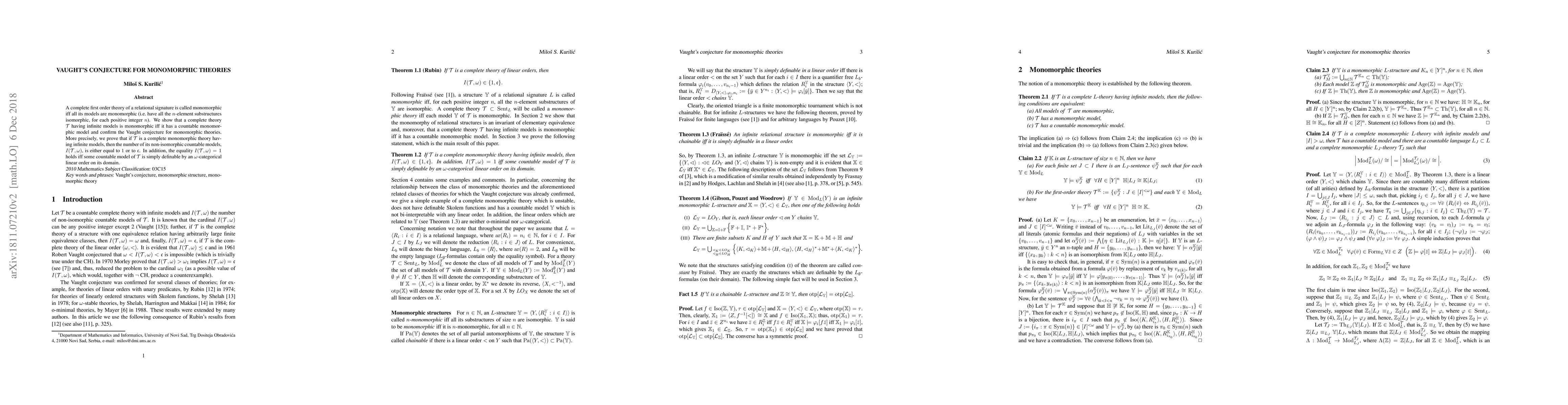 This paper proves Vaught's conjecture for monomorphic theories, showing that a complete monomorphic theory with infinite models has either one or continuum many non-isomorphic countable models, and identifies conditions under which it has exactly one countable model.