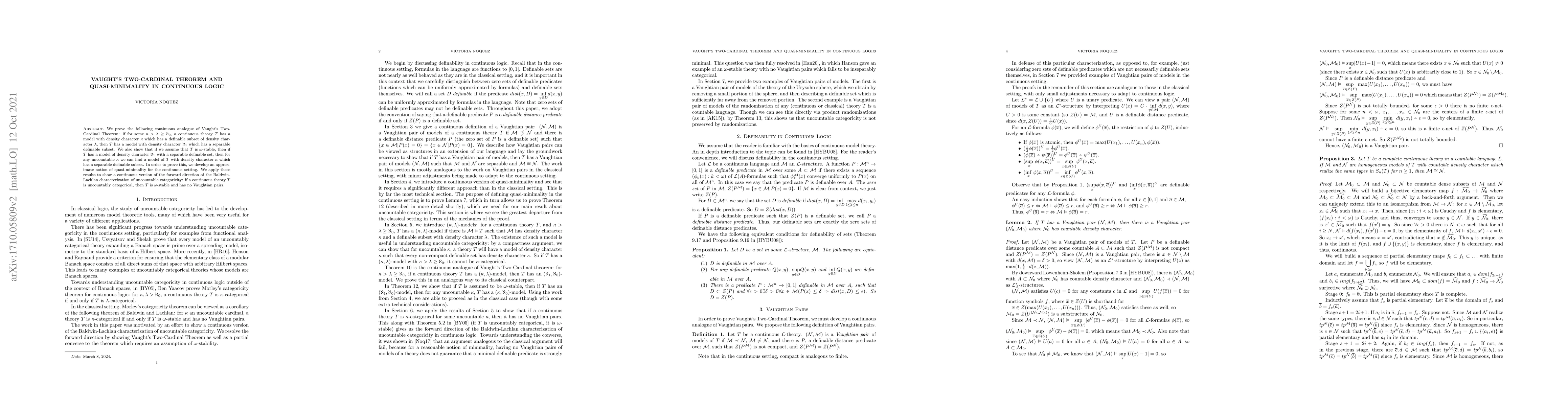The paper proves a continuous analogue of Vaught's Two-Cardinal Theorem, showing that if a theory has a model with certain properties, it can have models with stronger properties. It also develops a concept of quasi-minimality for continuous logic and applies these results to categoricity in theories.