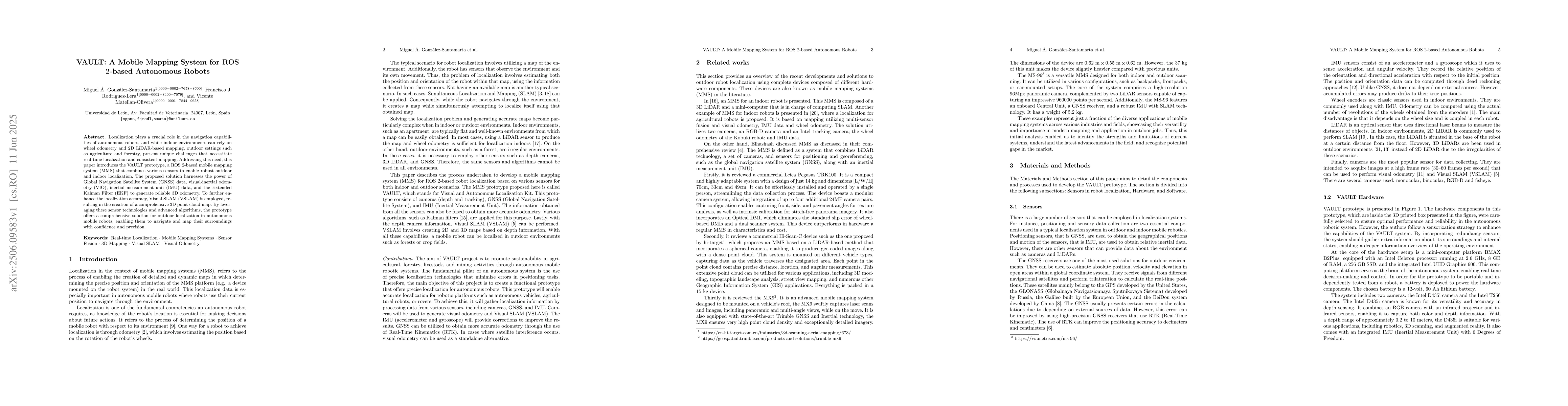 Localization plays a crucial role in the navigation capabilities of autonomous robots, and while indoor environments can rely on wheel odometry and 2D LiDAR-based mapping, outdoor settings such as agriculture and forestry, present unique challenges that necessitate real-time localization and consistent mapping. Addressing this need, this paper introduces the VAULT prototype, a ROS 2-based mobile mapping system (MMS) that combines various sensors to enable robust outdoor and indoor localization. The proposed solution harnesses the power of Global Navigation Satellite System (GNSS) data, visual-inertial odometry (VIO), inertial measurement unit (IMU) data, and the Extended Kalman Filter (EKF) to generate reliable 3D odometry. To further enhance the localization accuracy, Visual SLAM (VSLAM) is employed, resulting in the creation of a comprehensive 3D point cloud map. By leveraging these sensor technologies and advanced algorithms, the prototype offers a comprehensive solution for outdoor localization in autonomous mobile robots, enabling them to navigate and map their surroundings with confidence and precision.