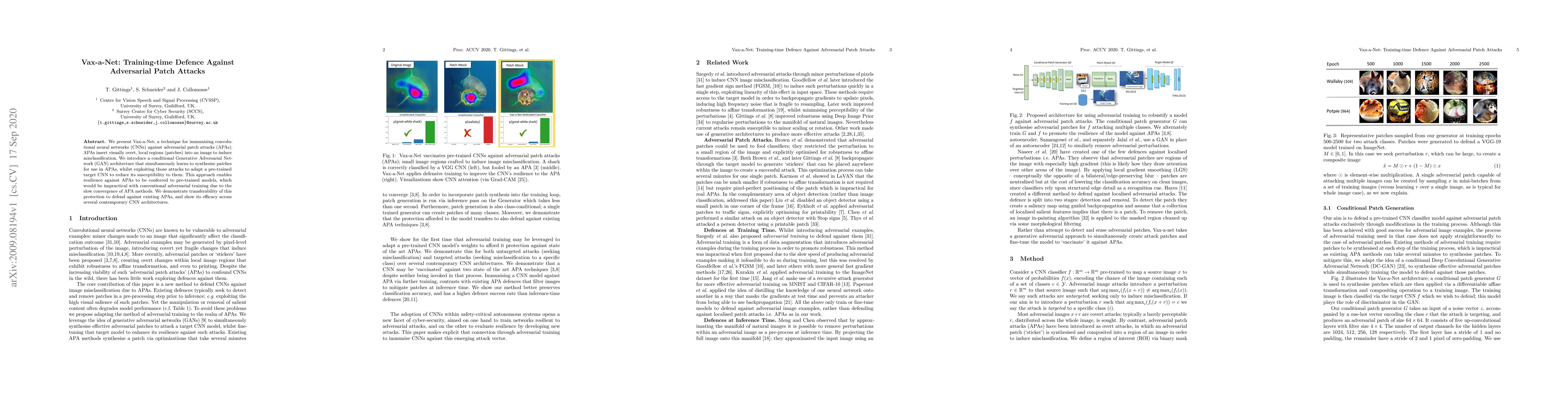 Vax-a-Net is a method that uses a Generative Adversarial Network (GAN) to train convolutional neural networks (CNNs) to resist adversarial patch attacks. These attacks manipulate images with visible patches to mislead classification. Vax-a-Net simultaneously creates these patches and trains the CNN to resist them, improving resilience against such attacks on pre-trained models, which is harder with traditional adversarial training methods.