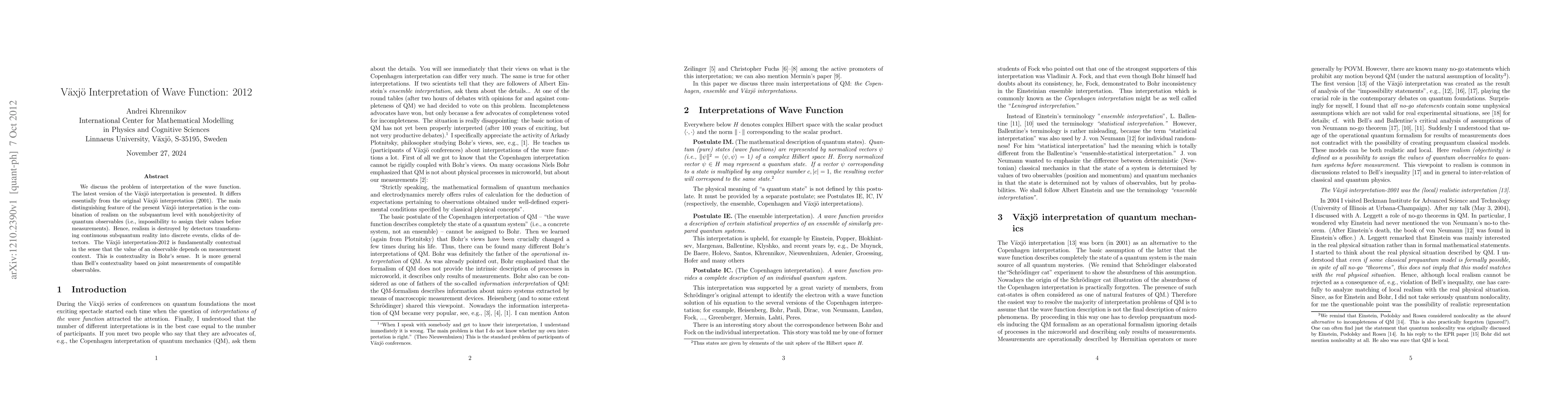 The 2012 V\"axj\"o interpretation of the wave function combines realism on the subquantum level with nonobjectivity of quantum observables, emphasizing contextuality where the value of an observable depends on the measurement context, surpassing Bell's contextuality. This interpretation differs significantly from the original 2001 version.