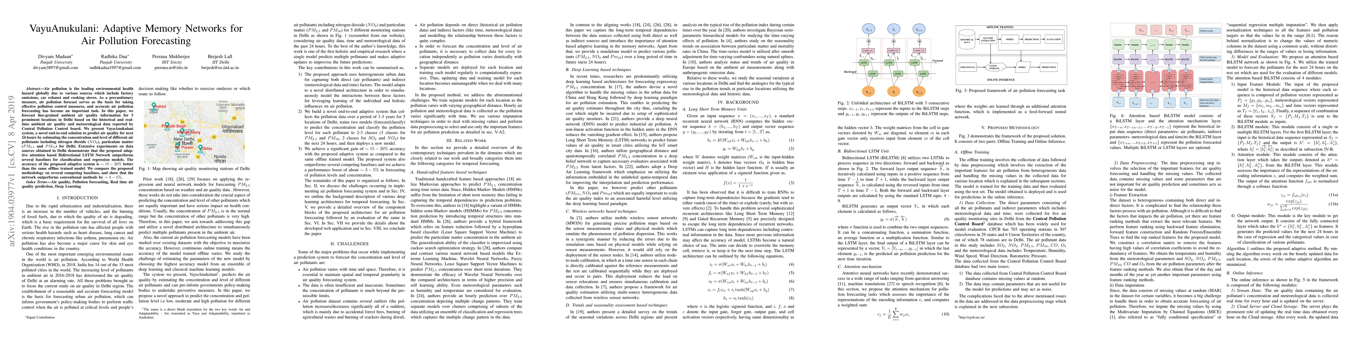 The paper introduces VayuAnukulani, an adaptive memory network for forecasting air pollution in Delhi, achieving up to 20% better accuracy than offline models. The system uses an adaptive attention-based Bidirectional LSTM to predict pollutant concentrations for the next 24 hours, outperforming conventional methods by 3-5%.
