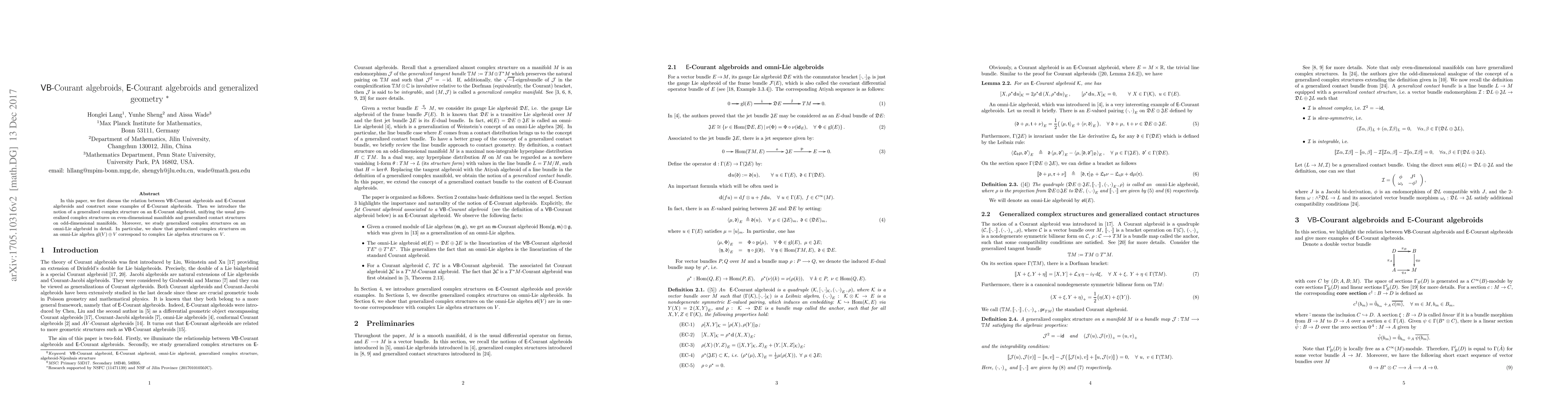 This paper explores the connections between VB-Courant algebroids and E-Courant algebroids, constructs examples of the latter, and introduces generalized complex structures on E-Courant algebroids, unifying both even-dimensional and odd-dimensional generalized structures, and specifically examines complex Lie algebra structures on V in the context of omni-Lie algebroids.
