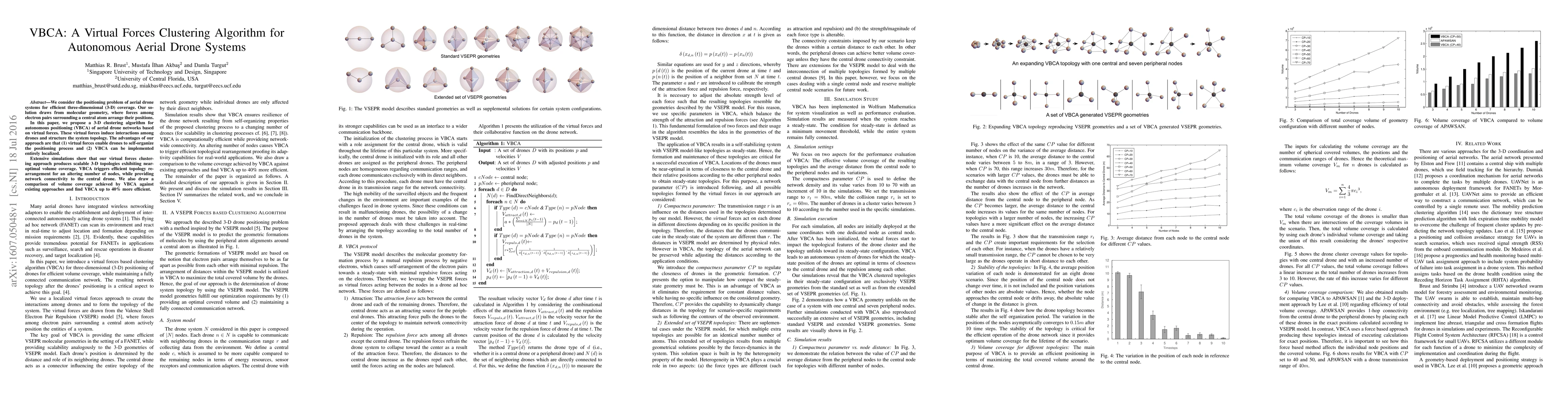 We consider the positioning problem of aerial drone systems for efficient three-dimensional (3-D) coverage. Our solution draws from molecular geometry, where forces among electron pairs surrounding a central atom arrange their positions. In this paper, we propose a 3-D clustering algorithm for autonomous positioning (VBCA) of aerial drone networks based on virtual forces. These virtual forces induce interactions among drones and structure the system topology. The advantages of our approach are that (1) virtual forces enable drones to self-organize the positioning process and (2) VBCA can be implemented entirely localized. Extensive simulations show that our virtual forces clustering approach produces scalable 3-D topologies exhibiting near-optimal volume coverage. VBCA triggers efficient topology rearrangement for an altering number of nodes, while providing network connectivity to the central drone. We also draw a comparison of volume coverage achieved by VBCA against existing approaches and find VBCA up to 40\% more efficient.