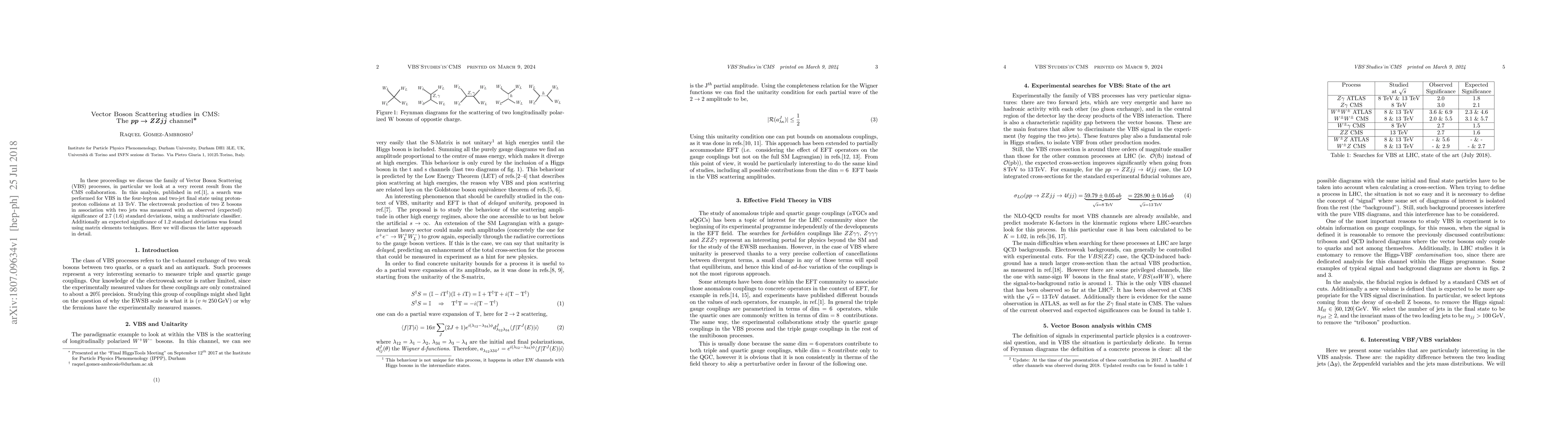 This paper discusses recent CMS results on Vector Boson Scattering (VBS) in proton-proton collisions at 13 TeV, focusing on the electroweak production of two Z bosons with two jets. The study found an observed significance of 2.7 standard deviations, with a detailed analysis of the matrix elements technique yielding an expected significance of 1.2 standard deviations.