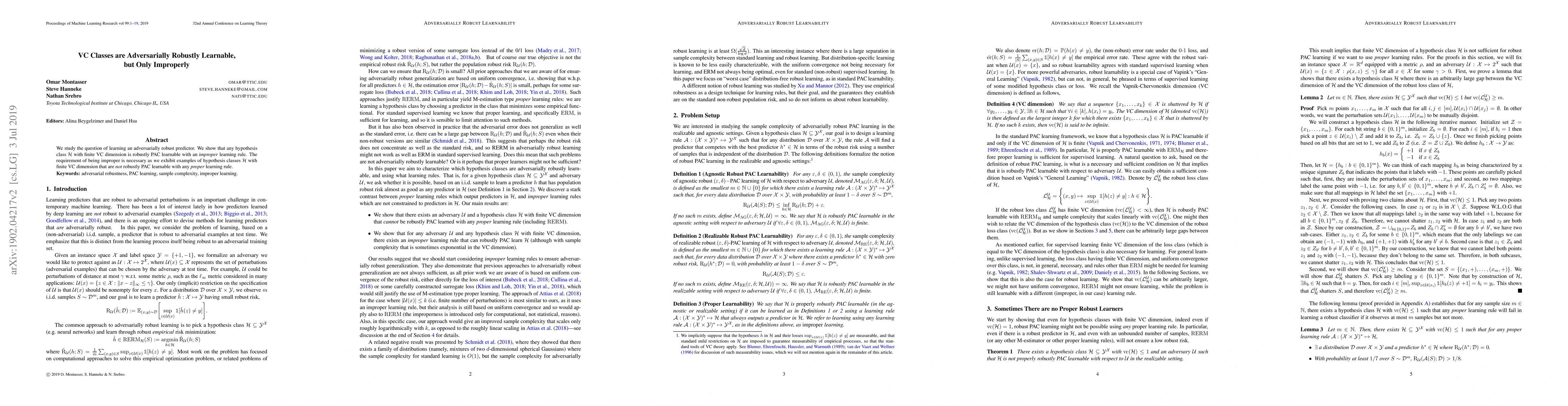 This paper demonstrates that hypothesis classes with finite VC dimension can be adversarially robustly learnable using improper learning rules, but proper learning rules fail for some classes, highlighting the necessity of improper methods.