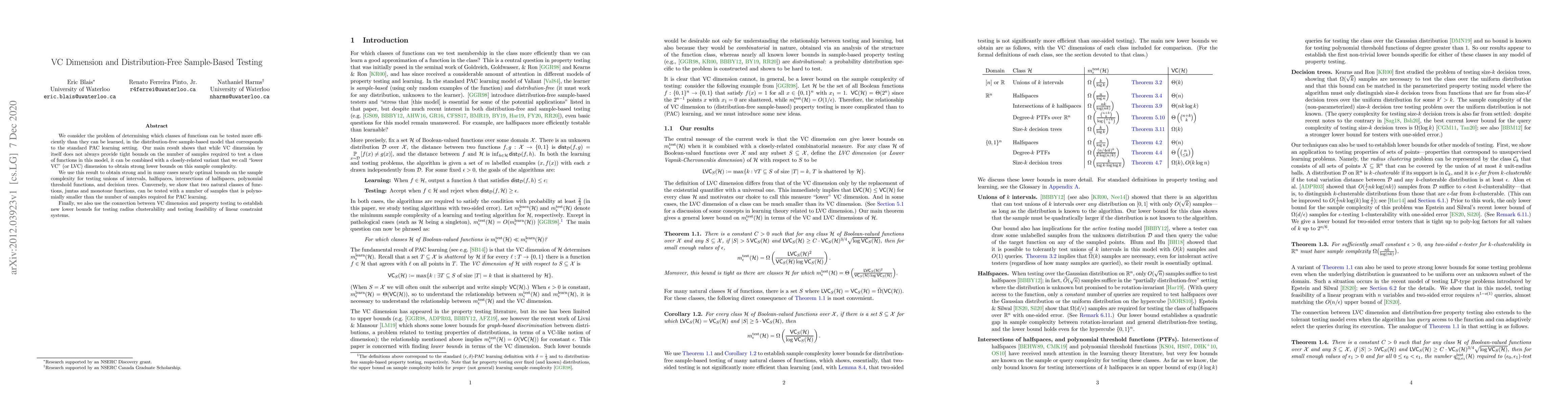 This paper investigates the sample complexity for testing various function classes in a distribution-free model, demonstrating that combining VC dimension with "lower VC" dimension provides strong lower bounds. It shows that certain classes like unions of intervals and decision trees have nearly optimal sample complexities for testing, while juntas and monotone functions can be tested more efficiently than learned.
