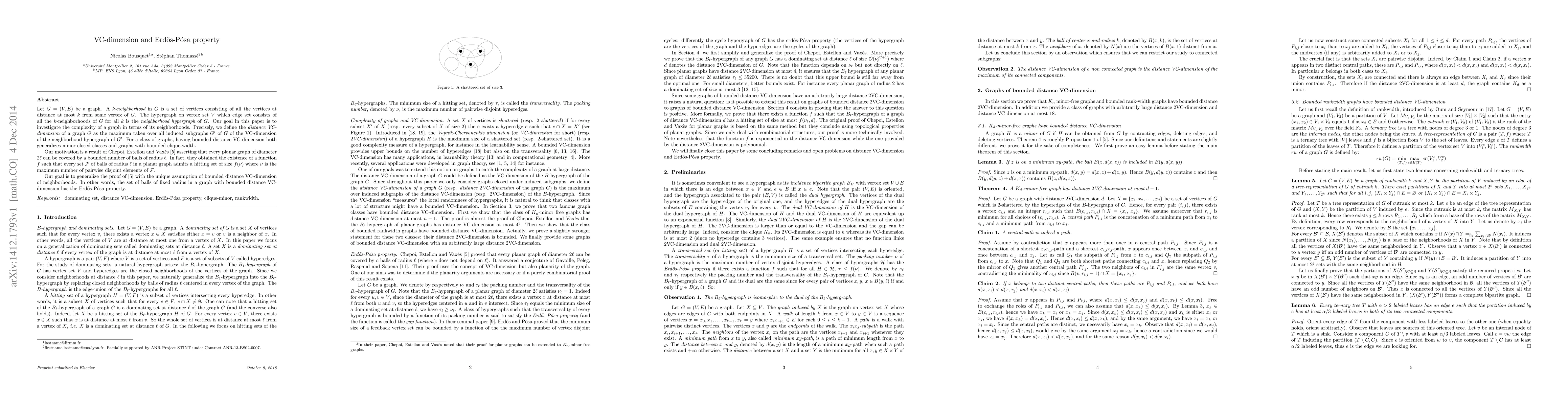 The paper introduces the concept of distance VC-dimension and proves that graphs with bounded distance VC-dimension have the Erd\H{o}s-P\'osa property for balls of fixed radius, generalizing previous results for planar graphs.