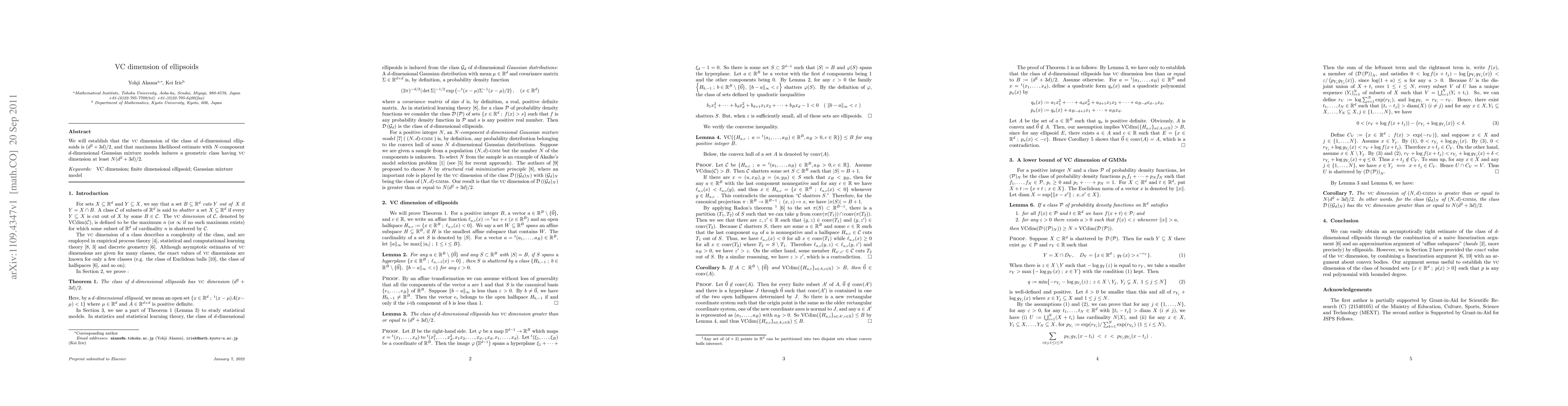 Summary: The paper establishes that the VC dimension of d-dimensional ellipsoids is (d^2+3d)/2. It also shows that maximum likelihood estimates using N-component Gaussian mixture models induce a geometric class with a VC dimension of at least N(d^2+3d)/2.
