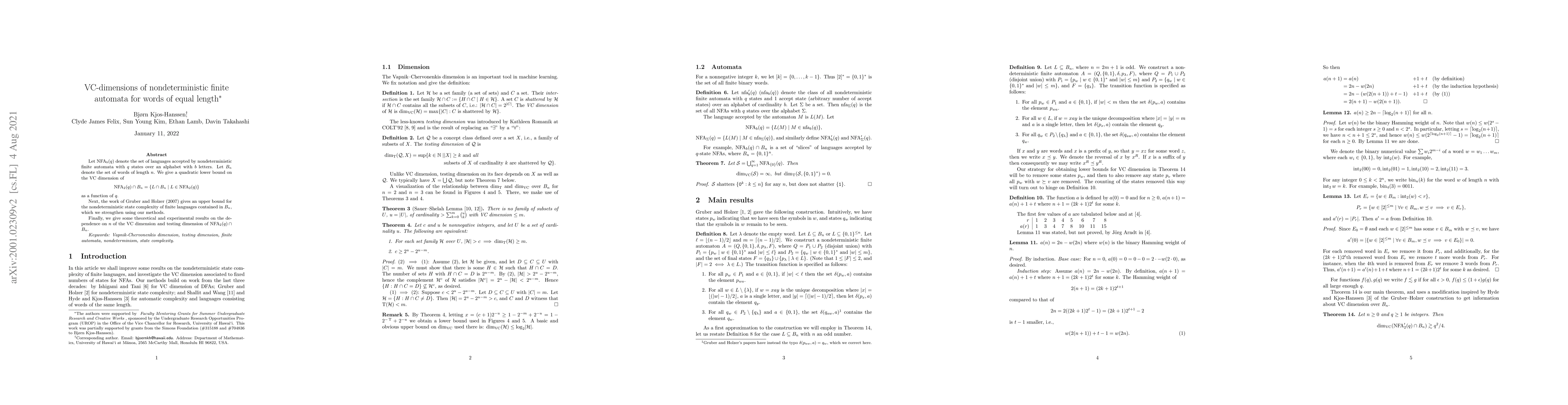 This paper establishes a quadratic lower bound on the VC dimension of nondeterministic finite automata with 2 states accepting languages of words of equal length, and strengthens an existing upper bound on their nondeterministic state complexity. It also explores the dependence of the VC dimension and testing dimension on the word length.