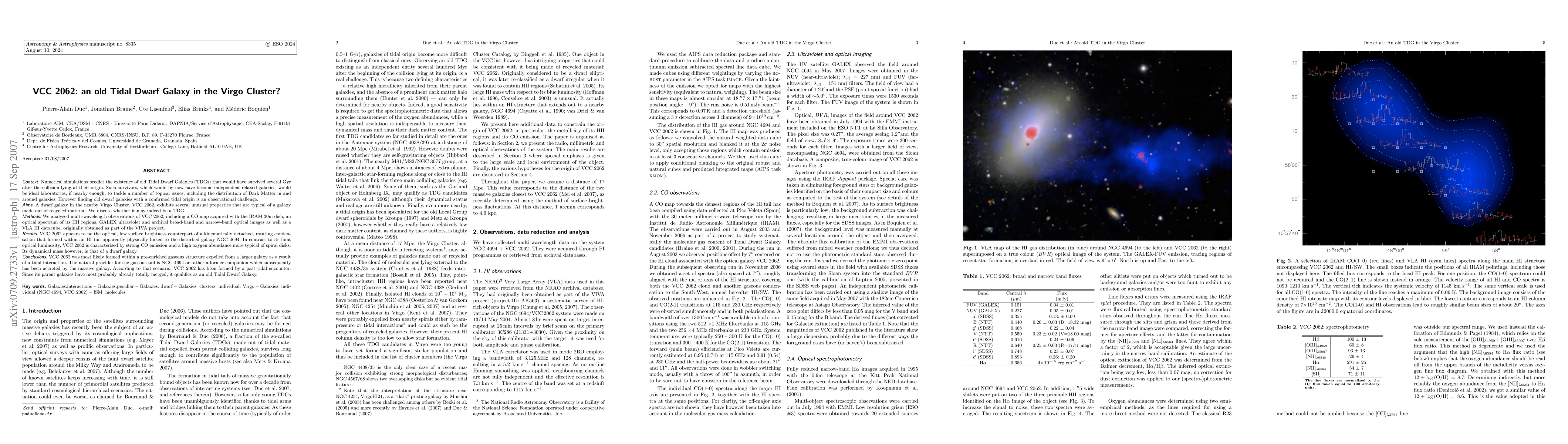 VCC 2062, a dwarf galaxy in the Virgo Cluster, exhibits properties suggesting it may be an old Tidal Dwarf Galaxy formed from material ejected during a past tidal interaction with NGC 4694 or a former companion, characterized by strong CO emission and a high oxygen abundance despite its low surface brightness.