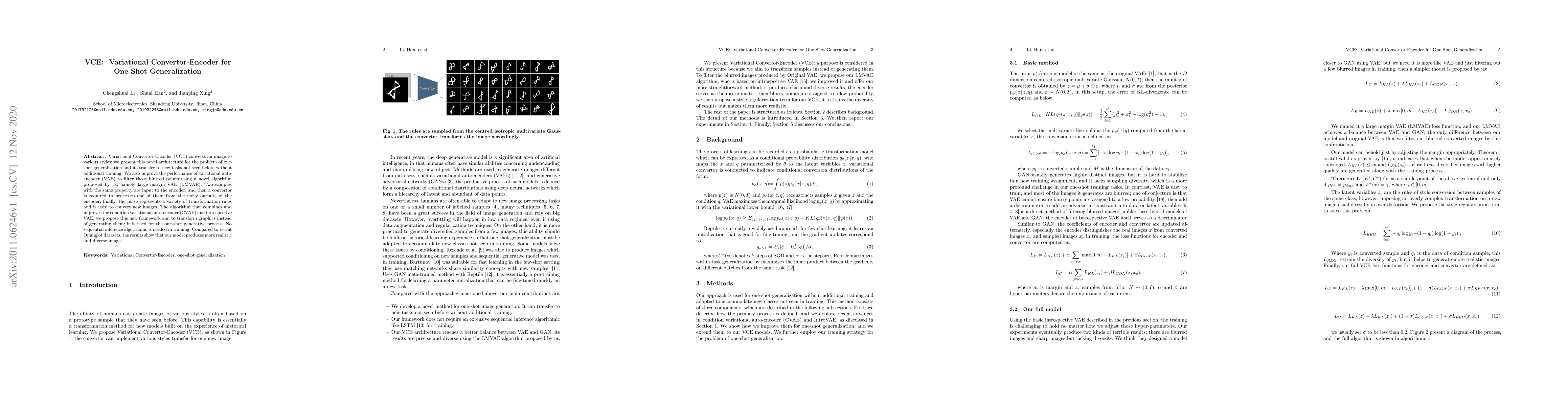 Variational Convertor-Encoder (VCE) converts an image to various styles; we present this novel architecture for the problem of one-shot generalization and its transfer to new tasks not seen before without additional training. We also improve the performance of variational auto-encoder (VAE) to filter those blurred points using a novel algorithm proposed by us, namely large margin VAE (LMVAE). Two samples with the same property are input to the encoder, and then a convertor is required to processes one of them from the noisy outputs of the encoder; finally, the noise represents a variety of transformation rules and is used to convert new images. The algorithm that combines and improves the condition variational auto-encoder (CVAE) and introspective VAE, we propose this new framework aim to transform graphics instead of generating them; it is used for the one-shot generative process. No sequential inference algorithmic is needed in training. Compared to recent Omniglot datasets, the results show that our model produces more realistic and diverse images.