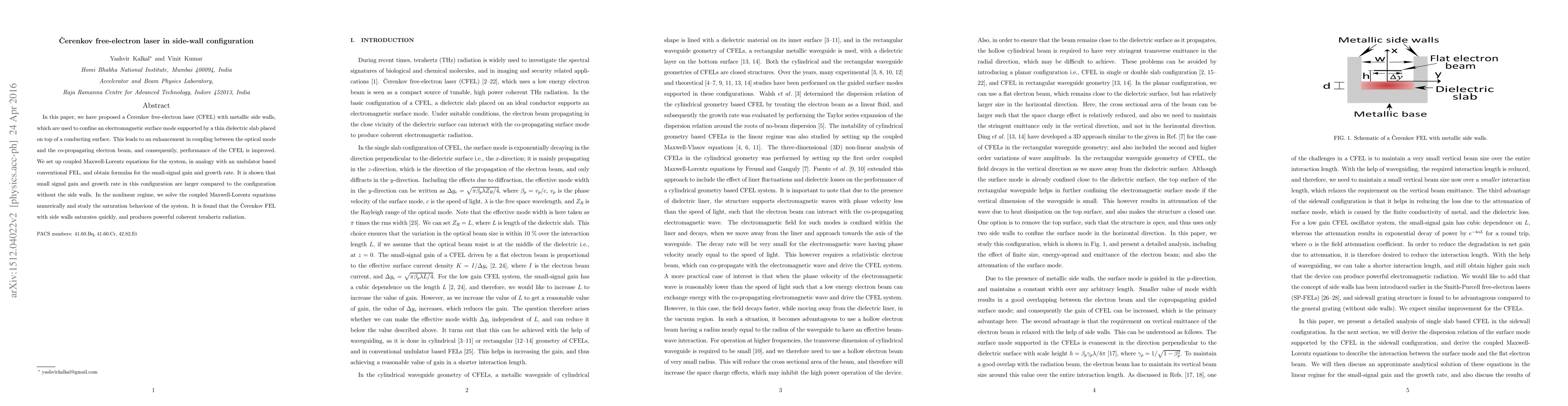 In this paper, we have proposed a \v{C}erenkov free-electron laser (CFEL) with metallic side walls, which are used to confine an electromagnetic surface mode supported by a thin dielectric slab placed on top of a conducting surface. This leads to an enhancement in coupling between the optical mode and the co-propagating electron beam, and consequently, performance of the CFEL is improved. We set up coupled Maxwell-Lorentz equations for the system, in analogy with an undulator based conventional FEL, and obtain formulas for the small-signal gain and growth rate. It is shown that small signal gain and growth rate in this configuration are larger compared to the configuration without the side walls. In the nonlinear regime, we solve the coupled Maxwell-Lorentz equations numerically and study the saturation behaviour of the system. It is found that the \v{C}erenkov FEL with side walls saturates quickly, and produces powerful coherent terahertz radiation.