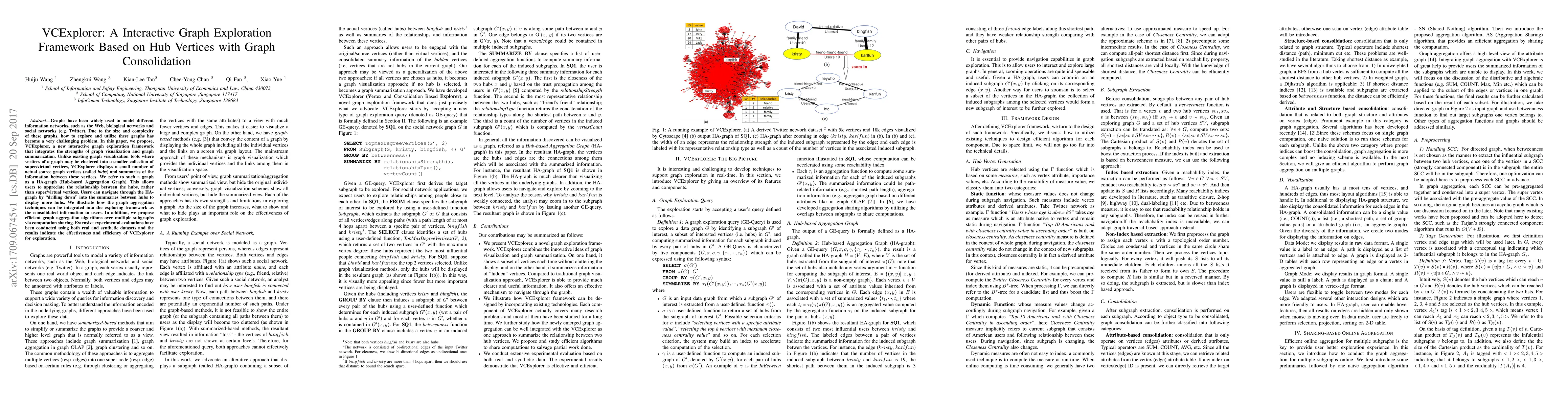 VCExplorer is an interactive framework for graph exploration that focuses on hub vertices, presenting a consolidated view of relationships through Hub-based Aggregation Graphs (HA-graphs). It enables users to navigate and "drill down" into summaries, demonstrating efficient graph aggregation techniques and algorithms for large, complex networks.