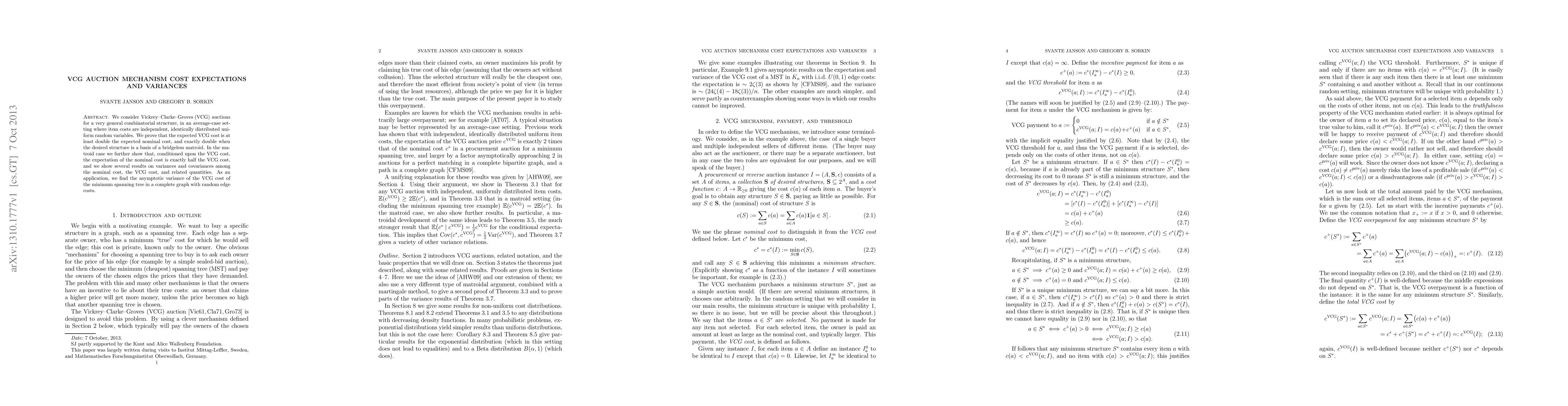VCG auction mechanisms can double expected costs compared to nominal costs in certain combinatorial structures, with further implications for variance analysis and applications.