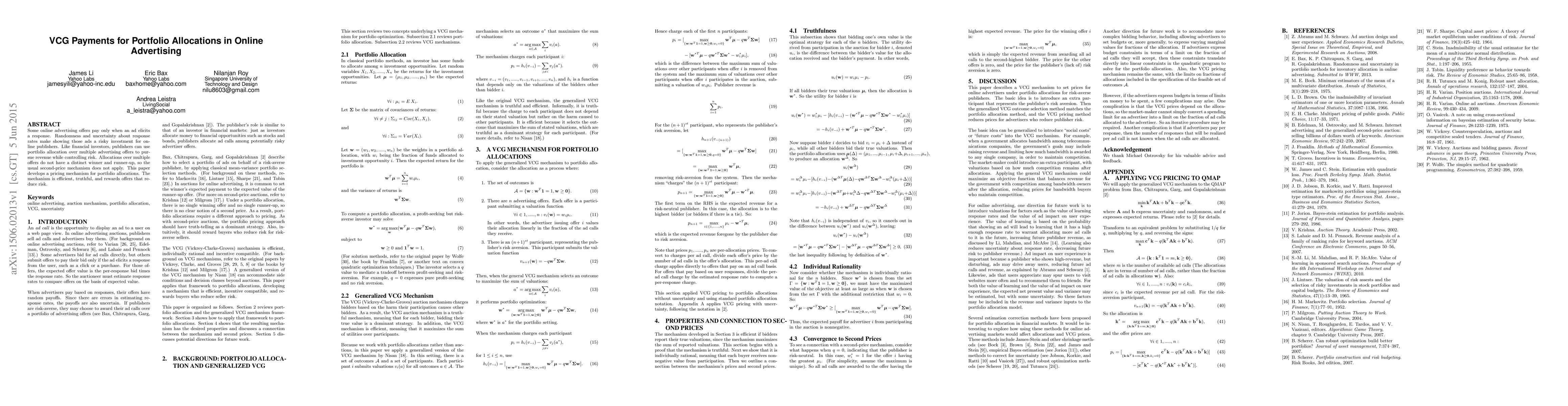 This paper proposes a VCG-based pricing mechanism for allocating advertising portfolios in online advertising, ensuring efficiency, truthfulness, and risk-reducing rewards for ad offers. The mechanism addresses the lack of a distinct winner in portfolio allocations, unlike traditional second-price mechanisms.