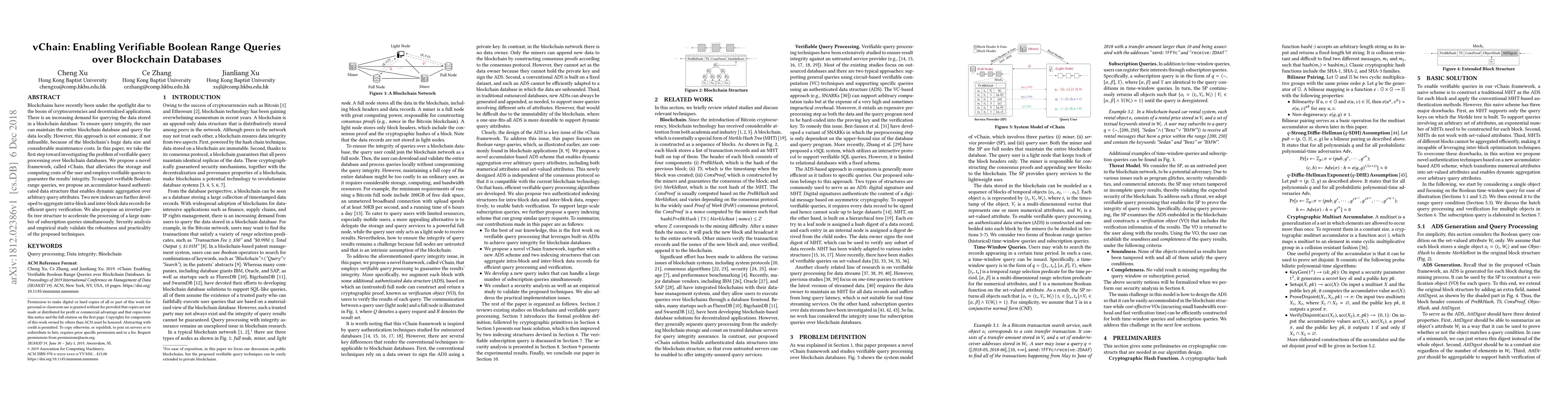 vChain proposes a novel framework to enable verifiable Boolean range queries over blockchain databases, addressing the economic and storage challenges of maintaining the entire blockchain. It introduces an accumulator-based data structure and new indexes for efficient query verification, along with an inverted prefix tree for handling multiple subscription queries, validated by security analysis and empirical study.
