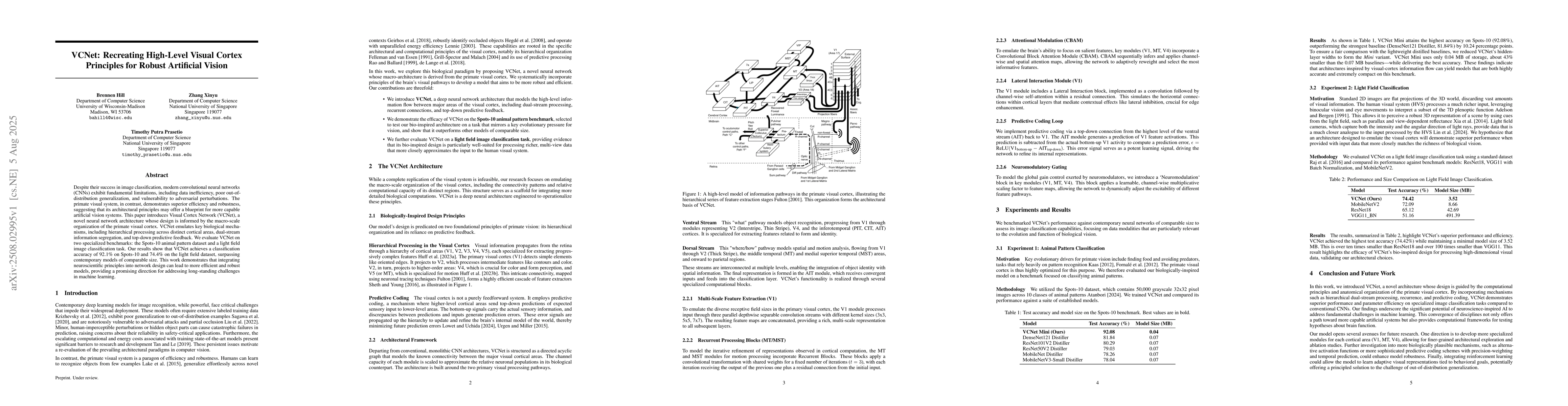 Despite their success in image classification, modern convolutional neural networks (CNNs) exhibit fundamental limitations, including data inefficiency, poor out-of-distribution generalization, and vulnerability to adversarial perturbations. The primate visual system, in contrast, demonstrates superior efficiency and robustness, suggesting that its architectural principles may offer a blueprint for more capable artificial vision systems. This paper introduces Visual Cortex Network (VCNet), a novel neural network architecture whose design is informed by the macro-scale organization of the primate visual cortex. VCNet emulates key biological mechanisms, including hierarchical processing across distinct cortical areas, dual-stream information segregation, and top-down predictive feedback. We evaluate VCNet on two specialized benchmarks: the Spots-10 animal pattern dataset and a light field image classification task. Our results show that VCNet achieves a classification accuracy of 92.1\% on Spots-10 and 74.4\% on the light field dataset, surpassing contemporary models of comparable size. This work demonstrates that integrating neuroscientific principles into network design can lead to more efficient and robust models, providing a promising direction for addressing long-standing challenges in machine learning.