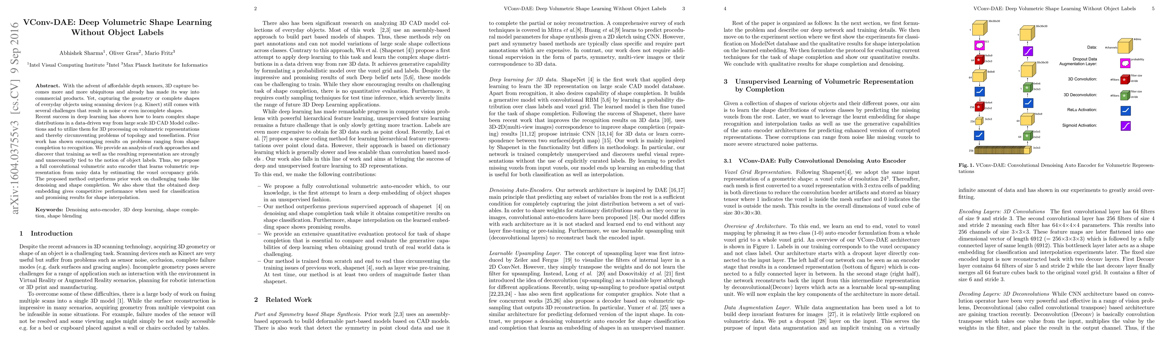 The paper introduces VConv-DAE, a full convolutional volumetric autoencoder for learning 3D shape representations from noisy depth data without object labels, achieving superior results in denoising, shape completion, classification, and interpolation compared to prior methods.