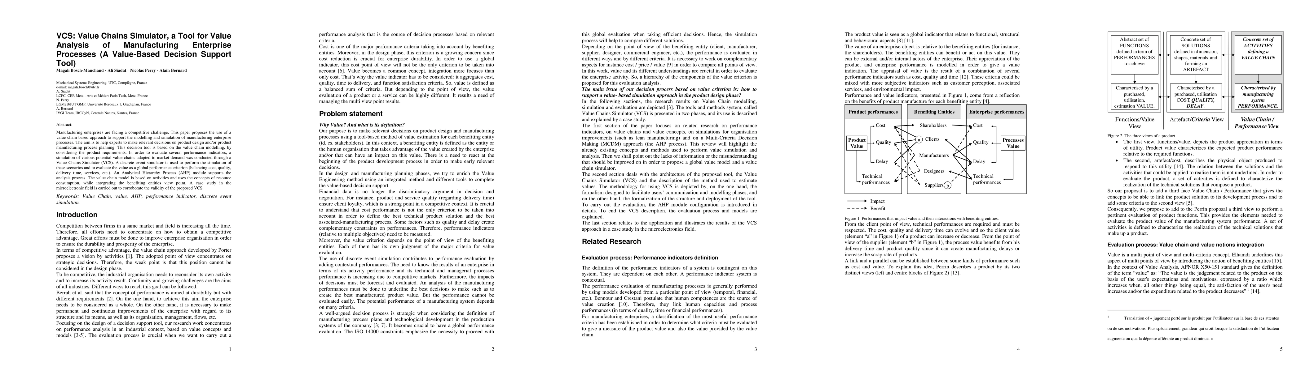 This paper introduces VCS, a Value Chains Simulator tool for modeling and simulating manufacturing processes to aid in decision-making for product design and process planning. The tool evaluates performance indicators through simulations and uses an Analytical Hierarchy Process for analysis, validated by a case study in microelectronics.