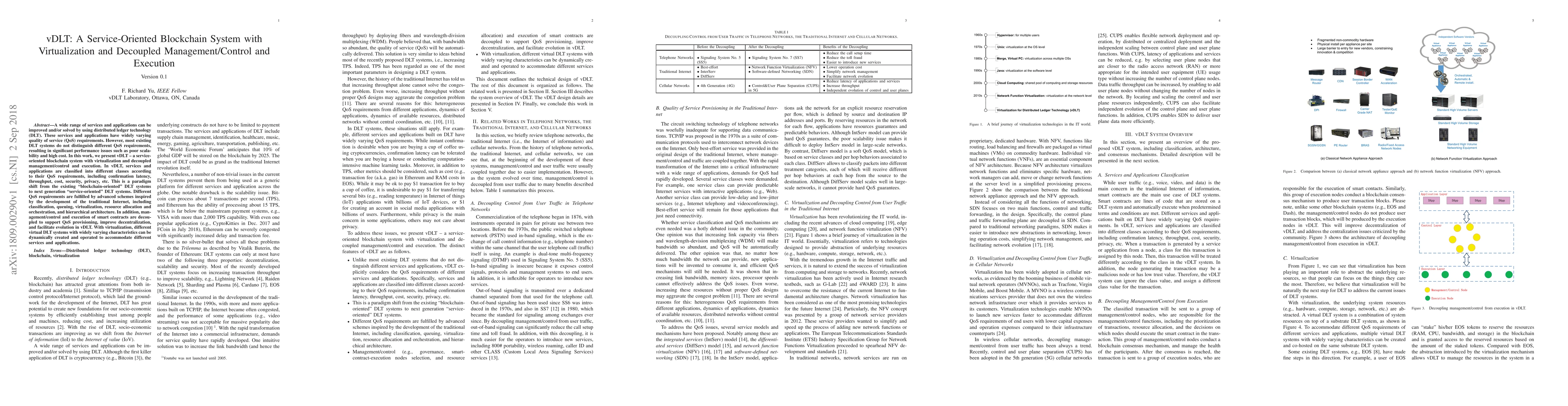 vDLT introduces a new service-oriented blockchain system that uses virtualization and decoupled management to address varying quality of service (QoS) requirements, improving scalability and cost efficiency compared to traditional blockchain systems. It dynamically creates different virtual DLT systems to meet diverse QoS needs and separates smart contract management from execution to enhance decentralization and flexibility.