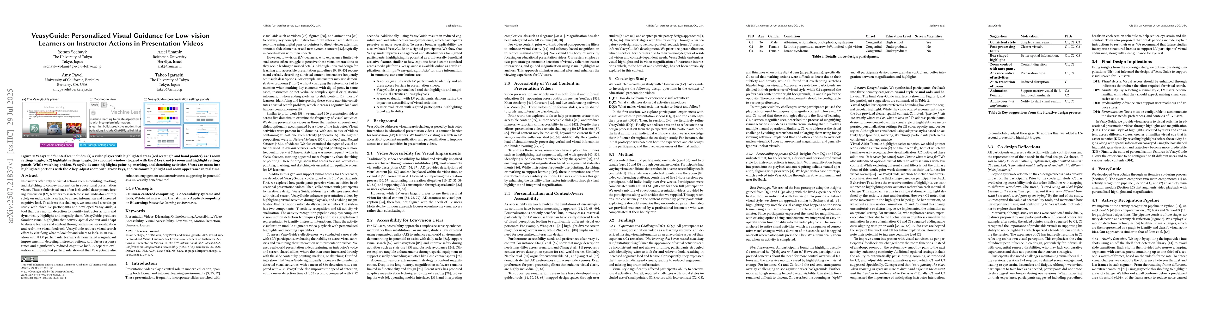 Instructors often rely on visual actions such as pointing, marking, and sketching to convey information in educational presentation videos. These subtle visual cues often lack verbal descriptions, forcing low-vision (LV) learners to search for visual indicators or rely solely on audio, which can lead to missed information and increased cognitive load. To address this challenge, we conducted a co-design study with three LV participants and developed VeasyGuide, a tool that uses motion detection to identify instructor actions and dynamically highlight and magnify them. VeasyGuide produces familiar visual highlights that convey spatial context and adapt to diverse learners and content through extensive personalization and real-time visual feedback. VeasyGuide reduces visual search effort by clarifying what to look for and where to look. In an evaluation with 8 LV participants, learners demonstrated a significant improvement in detecting instructor actions, with faster response times and significantly reduced cognitive load. A separate evaluation with 8 sighted participants showed that VeasyGuide also enhanced engagement and attentiveness, suggesting its potential as a universally beneficial tool.