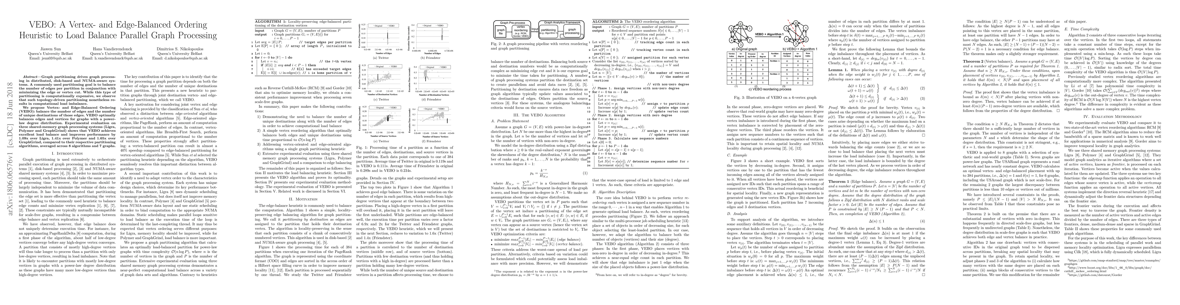 VEBO is a heuristic for load balancing in parallel graph processing by balancing both edges and vertex destinations. It outperforms existing partitioning algorithms in shared-memory systems, achieving up to 1.65x performance improvement.