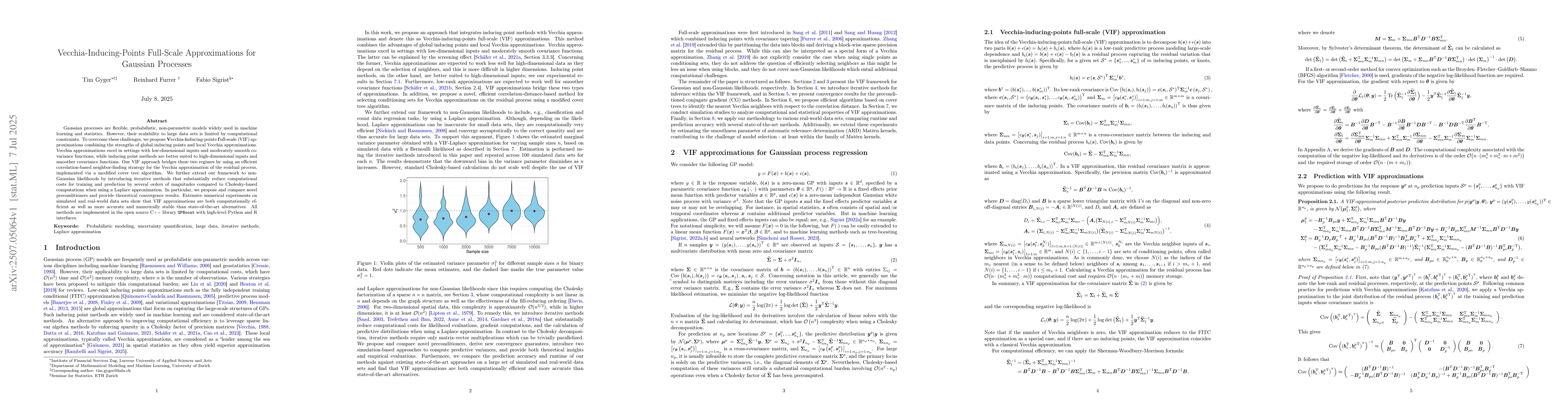 Gaussian processes are flexible, probabilistic, non-parametric models widely used in machine learning and statistics. However, their scalability to large data sets is limited by computational constraints. To overcome these challenges, we propose Vecchia-inducing-points full-scale (VIF) approximations combining the strengths of global inducing points and local Vecchia approximations. Vecchia approximations excel in settings with low-dimensional inputs and moderately smooth covariance functions, while inducing point methods are better suited to high-dimensional inputs and smoother covariance functions. Our VIF approach bridges these two regimes by using an efficient correlation-based neighbor-finding strategy for the Vecchia approximation of the residual process, implemented via a modified cover tree algorithm. We further extend our framework to non-Gaussian likelihoods by introducing iterative methods that substantially reduce computational costs for training and prediction by several orders of magnitudes compared to Cholesky-based computations when using a Laplace approximation. In particular, we propose and compare novel preconditioners and provide theoretical convergence results. Extensive numerical experiments on simulated and real-world data sets show that VIF approximations are both computationally efficient as well as more accurate and numerically stable than state-of-the-art alternatives. All methods are implemented in the open source C++ library GPBoost with high-level Python and R interfaces.