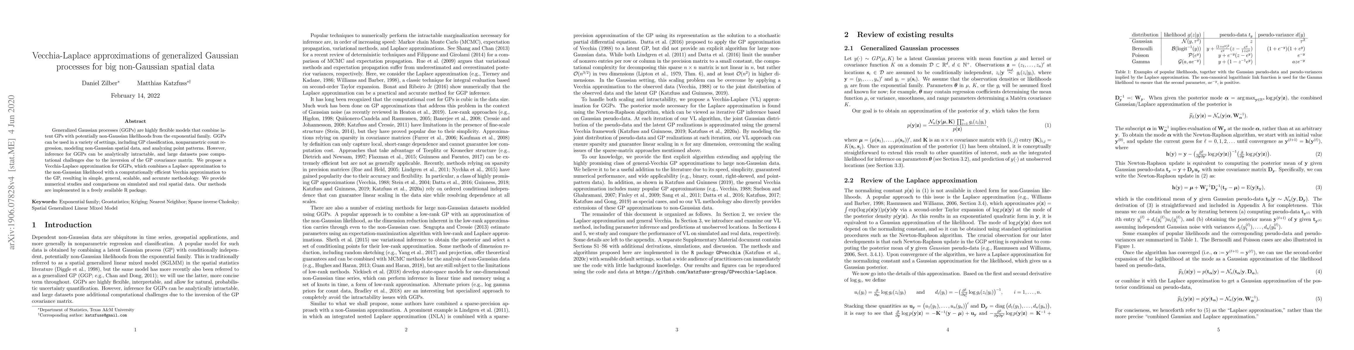 This paper proposes a Vecchia-Laplace approximation for generalized Gaussian processes (GGPs) to efficiently handle large non-Gaussian spatial datasets. The method combines a Laplace approximation for the likelihood with a Vecchia approximation for the Gaussian process, offering a scalable and accurate solution to computational challenges.