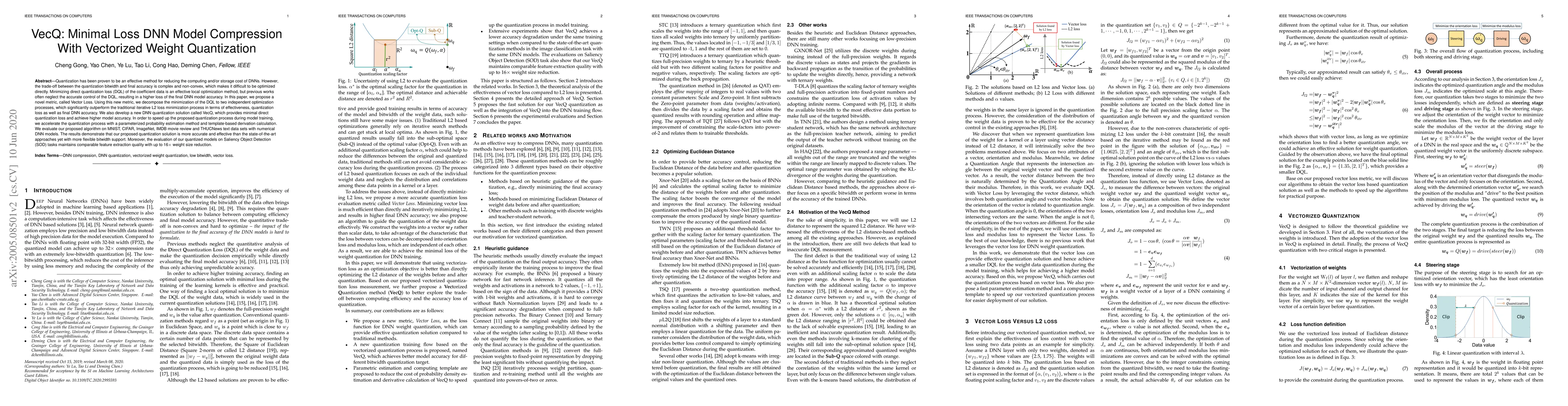 This paper introduces VecQ, a novel DNN model compression method using vectorized weight quantization that minimizes direct quantization loss (DQL) to achieve higher model accuracy. The proposed Vector Loss metric and accelerated quantization process enable effective bitwidth support and significant weight size reduction while maintaining feature extraction quality.