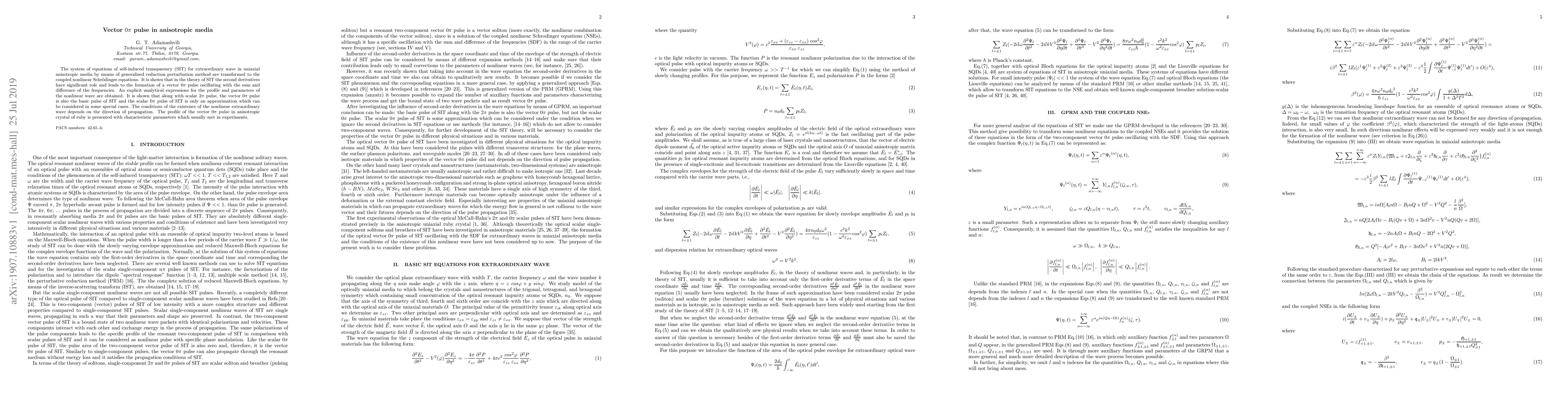 The paper presents a study on vector $0pi$ pulse formation in anisotropic media using the self-induced transparency (SIT) system. By employing the generalized reduction perturbation method, the SIT equations for extraordinary waves in uniaxial anisotropic media are transformed into coupled nonlinear Schrödinger equations. The research reveals that vector $0pi$ pulse, oscillating at frequency sum and difference, is a fundamental pulse in SIT, unlike the scalar $0pi$ pulse, which is merely an approximation under specific conditions. The existence of nonlinear extraordinary waves depends on propagation direction, and the paper provides an explicit analytical expression and characteristic parameters for vector $0pi$ pulse in ruby crystals.