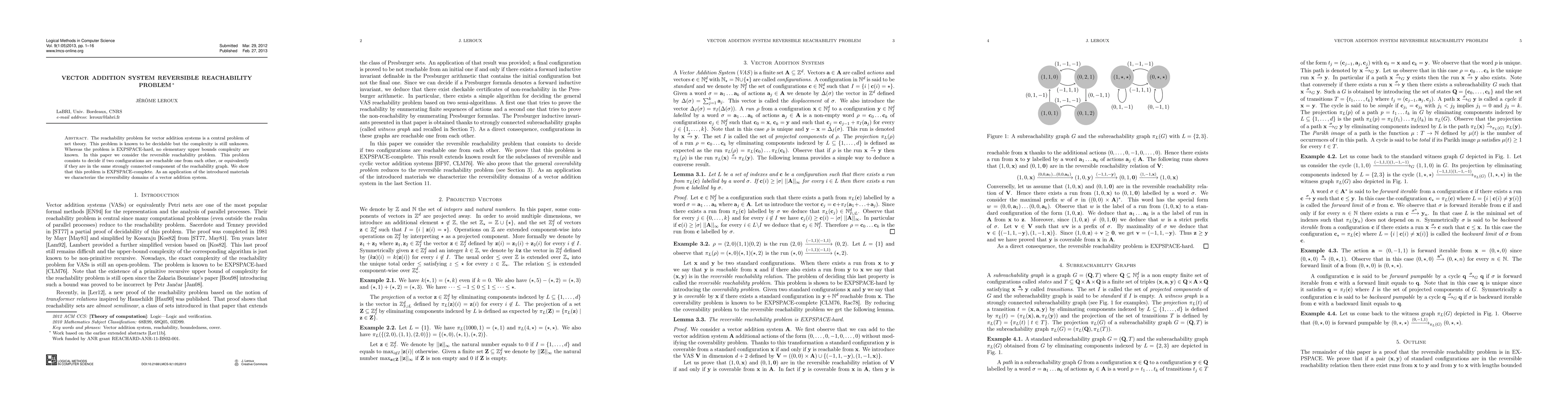 The paper addresses the reversible reachability problem for vector addition systems, proving it to be EXPSPACE-complete. It also characterizes the reversibility domains of these systems as an application of the findings.