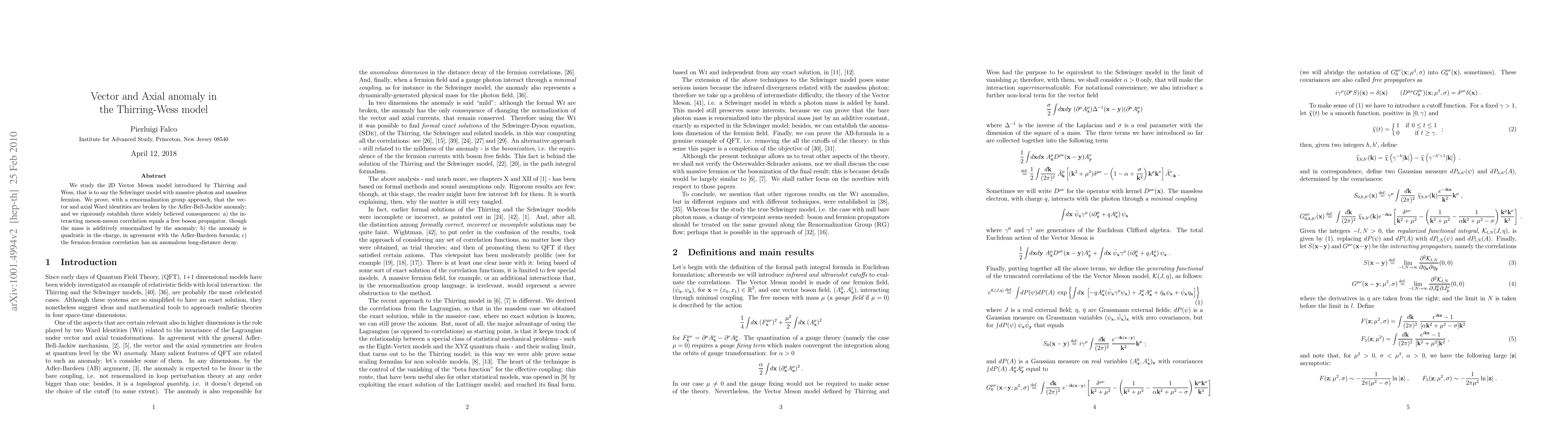 This paper investigates the 2D Vector Meson model, proving the Adler-Bell-Jackiw anomaly breaks vector and axial Ward identities in the Thirring-Wess model using a renormalization group approach. It confirms three consequences: meson-meson correlation behaves like a free boson propagator with renormalized mass, the anomaly is quadratic in charge, and fermion-fermion correlation exhibits anomalous long-distance decay.