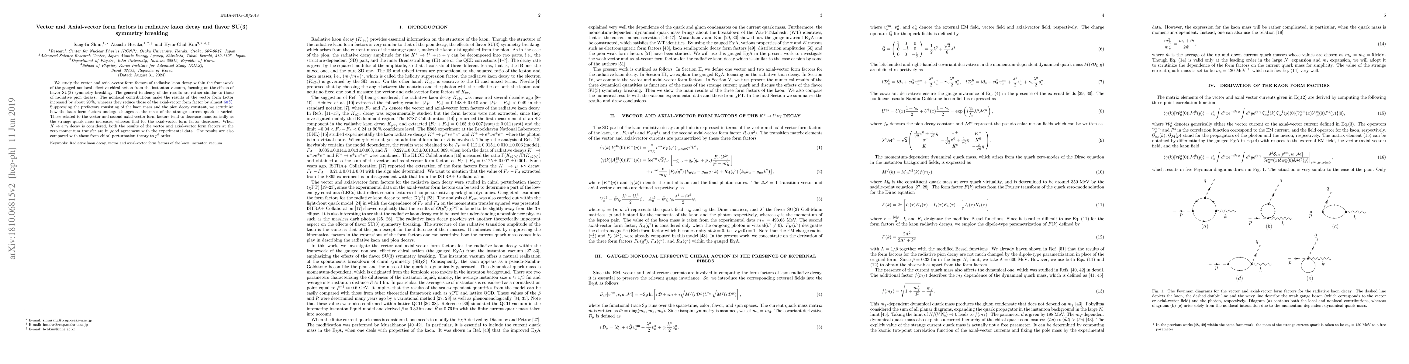 This paper investigates vector and axial-vector form factors in radiative kaon decay using a gauged nonlocal effective chiral action, highlighting flavor SU(3) symmetry breaking effects. The study finds that nonlocal contributions increase vector form factors by $20\,\%$ and decrease axial-vector form factors by $30\,\%$, with results aligning well with experimental data and comparisons to chiral perturbation theory.