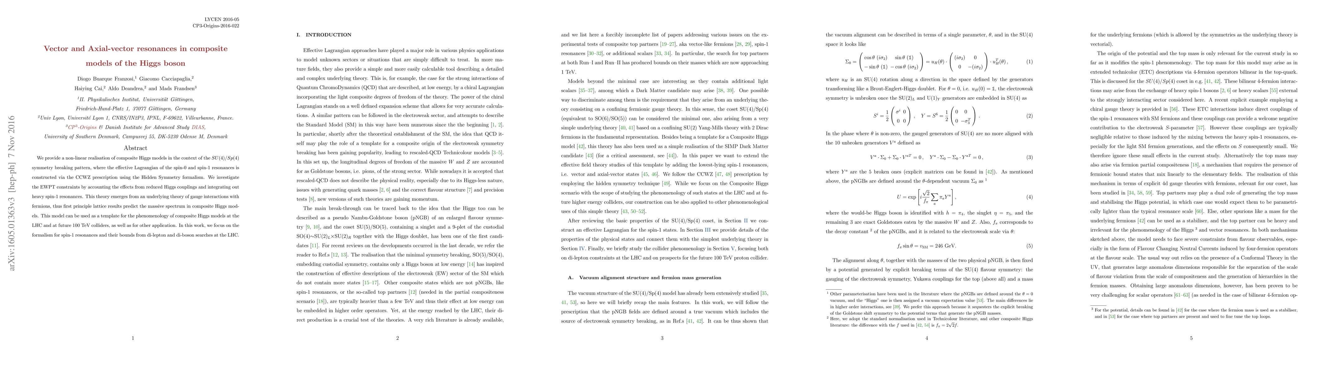 We provide a non-linear realisation of composite Higgs models in the context of the SU(4)/Sp(4) symmetry breaking pattern, where the effective Lagrangian of the spin-0 and spin-1 resonances is constructed via the CCWZ prescription using the Hidden Symmetry formalism. We investigate the EWPT constraints by accounting the effects from reduced Higgs couplings and integrating out heavy spin-1 resonances. This theory emerges from an underlying theory of gauge interactions with fermions, thus first principle lattice results predict the massive spectrum in composite Higgs models. This model can be used as a template for the phenomenology of composite Higgs models at the LHC and at future 100 TeV colliders, as well as for other application. In this work, we focus on the formalism for spin-1 resonances and their bounds from di-lepton and di-boson searches at the LHC.