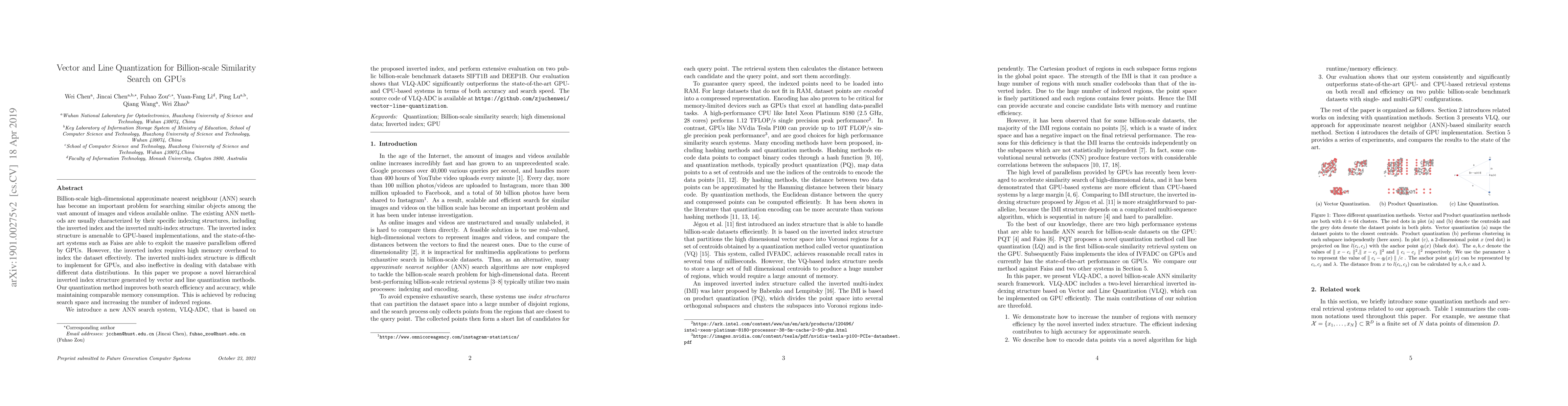 This paper proposes a novel hierarchical inverted index based on vector and line quantization methods to enhance billion-scale high-dimensional approximate nearest neighbor search on GPUs. The VLQ-ADC system demonstrates superior accuracy and search speed compared to existing GPU-based systems, achieving effective reduction in search space and improved indexed regions.