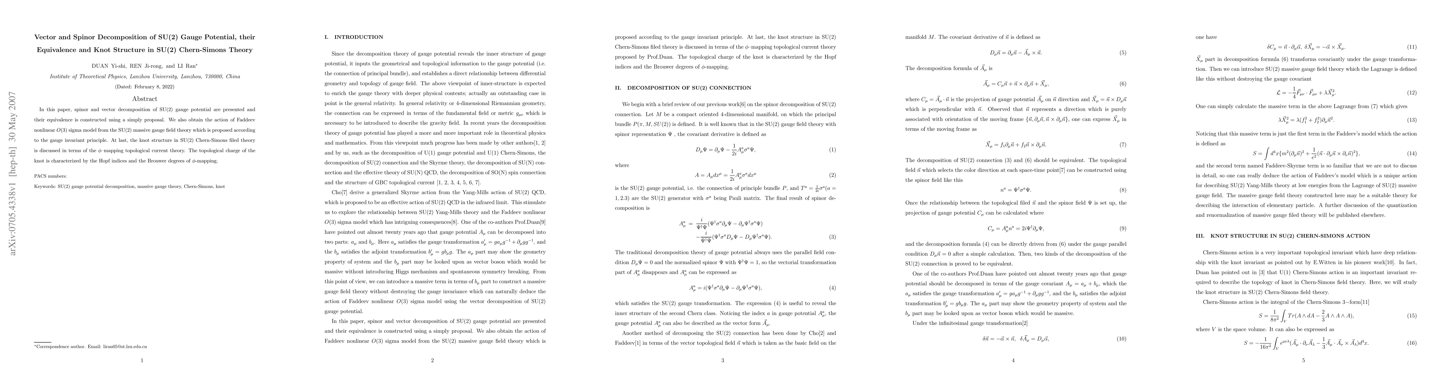 This paper presents the equivalence between spinor and vector decompositions of the SU(2) gauge potential, constructs the action of the Faddeev nonlinear O(3) sigma model from massive gauge field theory, and explores the knot structure in SU(2) Chern-Simons theory using $\phi$-mapping topological current theory, characterizing the topological charge via Hopf indices and Brouwer degrees.