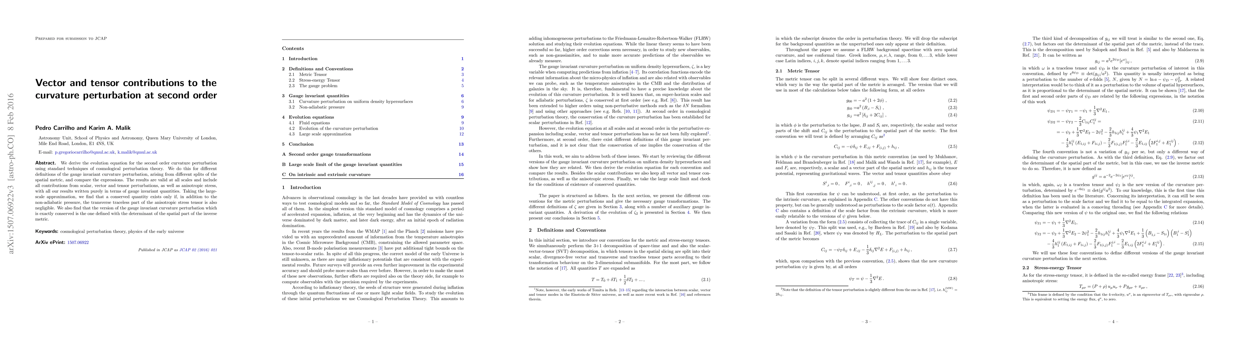 We derive the evolution equation for the second order curvature perturbation using standard techniques of cosmological perturbation theory. We do this for different definitions of the gauge invariant curvature perturbation, arising from different splits of the spatial metric, and compare the expressions. The results are valid at all scales and include all contributions from scalar, vector and tensor perturbations, as well as anisotropic stress, with all our results written purely in terms of gauge invariant quantities. Taking the large-scale approximation, we find that a conserved quantity exists only if, in addition to the non-adiabatic pressure, the transverse traceless part of the anisotropic stress tensor is also negligible. We also find that the version of the gauge invariant curvature perturbation which is exactly conserved is the one defined with the determinant of the spatial part of the inverse metric.