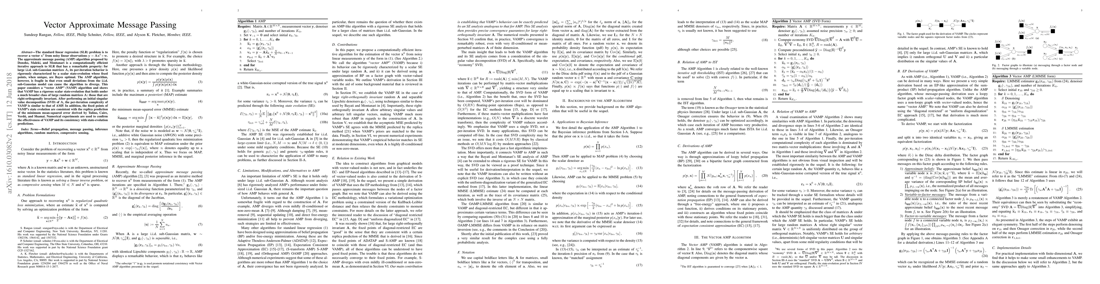 This paper proposes the vector approximate message passing (VAMP) algorithm to solve linear regression problems, presenting a computationally efficient method that generalizes the approximate message passing (AMP) algorithm. VAMP's state evolution rigorously holds under a broader class of random matrices, specifically those that are right-orthogonally invariant, enhancing its robustness compared to AMP.
