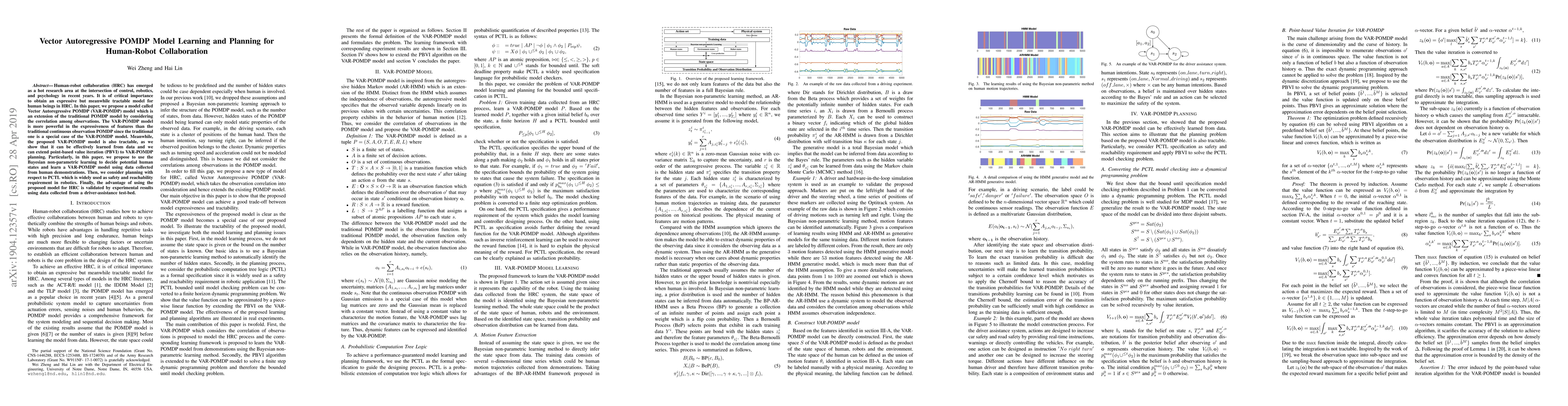 This paper proposes a Vector Autoregressive POMDP (VAR-POMDP) model for human-robot collaboration, extending traditional POMDPs to better capture observation correlations. The model is shown to be both expressive and tractable, enabling effective learning from human demonstration data and planning using Bayesian non-parametric methods.
