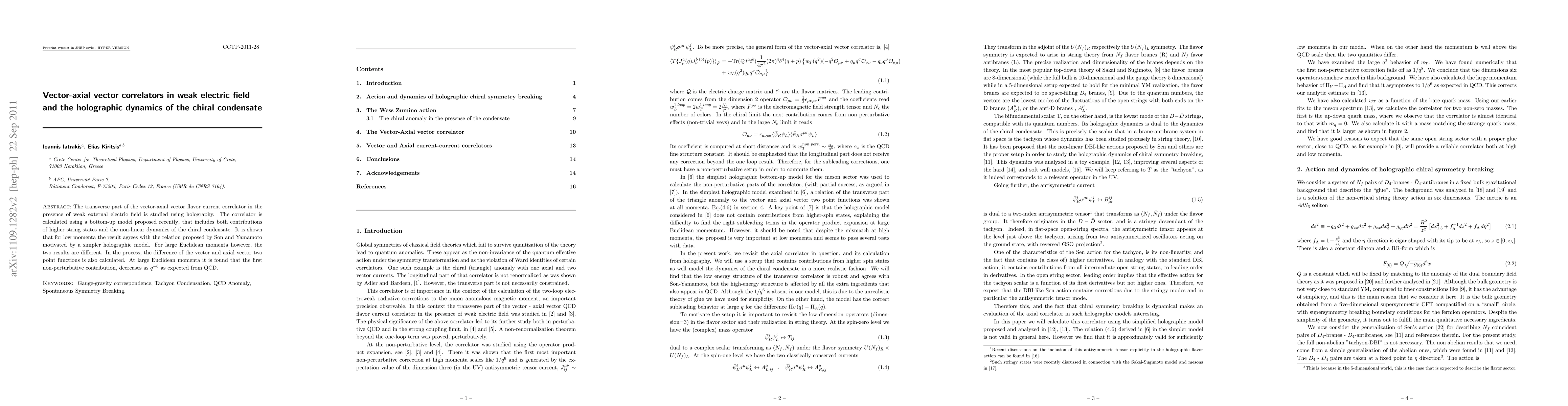The transverse part of the vector-axial vector flavor current correlator in the presence of weak external electric field is studied using holography. The correlator is calculated using a bottom-up model arxiv:1003.2377 {proposed recently}, that includes the non-linear dynamics of the chiral condensate. It is shown that for low momenta the result agrees with the relation proposed by arXiv:1010.0718 {Son and Yamamoto} motivated by a simpler holographic model. For large Euclidean momenta however, the two results diverge. In the process, the difference of the vector and axial vector two point functions is also calculated. At large Euclidean momenta it is found that the first non-perturbative contribution, decreases as $q^{-6}$ as expected from QCD.