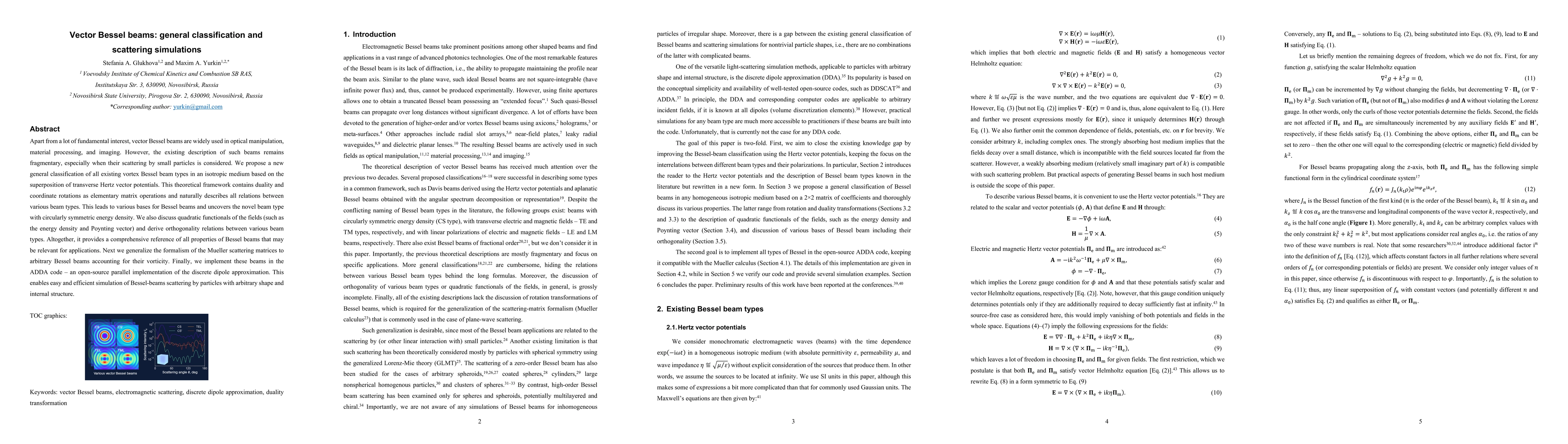The paper introduces a new general classification of vector Bessel beams, derives orthogonality relations, generalizes Mueller scattering matrices for Bessel beams, and implements these beams in the ADDA code for scattering simulations.