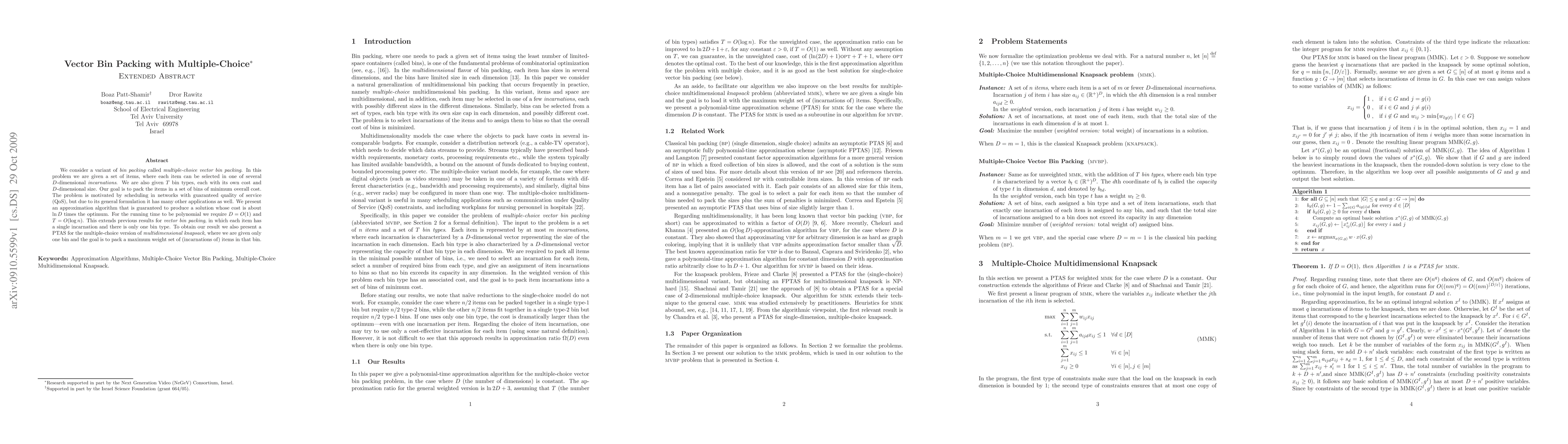 We consider a variant of bin packing called multiple-choice vector bin packing. In this problem we are given a set of items, where each item can be selected in one of several $D$-dimensional incarnations. We are also given $T$ bin types, each with its own cost and $D$-dimensional size. Our goal is to pack the items in a set of bins of minimum overall cost. The problem is motivated by scheduling in networks with guaranteed quality of service (QoS), but due to its general formulation it has many other applications as well. We present an approximation algorithm that is guaranteed to produce a solution whose cost is about $\ln D$ times the optimum. For the running time to be polynomial we require $D=O(1)$ and $T=O(\log n)$. This extends previous results for vector bin packing, in which each item has a single incarnation and there is only one bin type. To obtain our result we also present a PTAS for the multiple-choice version of multidimensional knapsack, where we are given only one bin and the goal is to pack a maximum weight set of (incarnations of) items in that bin.