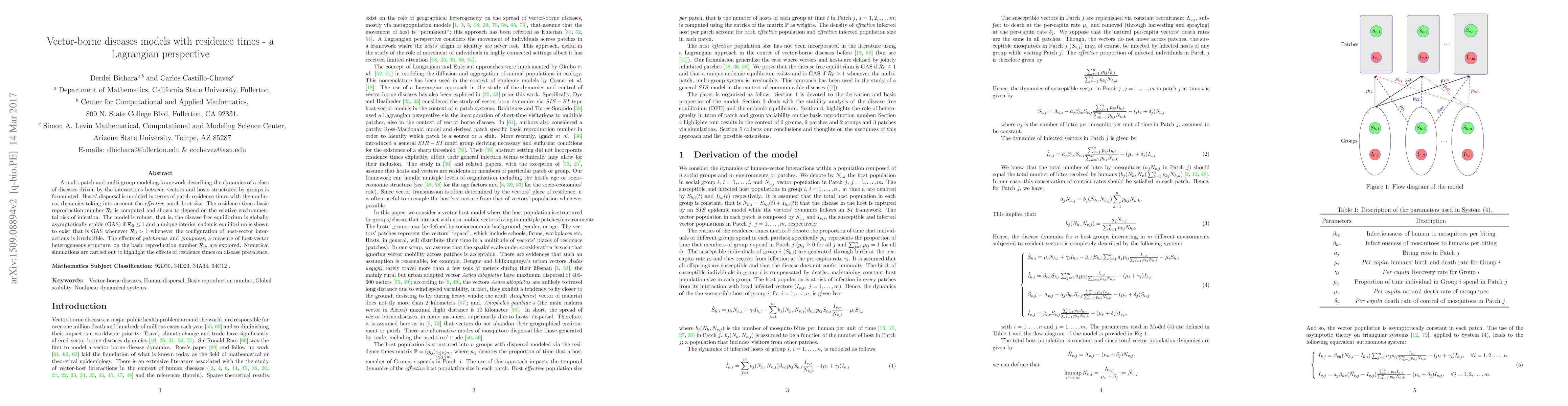 This paper formulates a multi-patch, multi-group model for vector-borne diseases, incorporating hosts' dispersal through patch-residence times and effective patch-host size. It demonstrates global stability conditions based on the basic reproduction number $\mathcal R_0$, which depends on environmental risk, and explores the effects of patchiness and group structure on disease dynamics through numerical simulations.