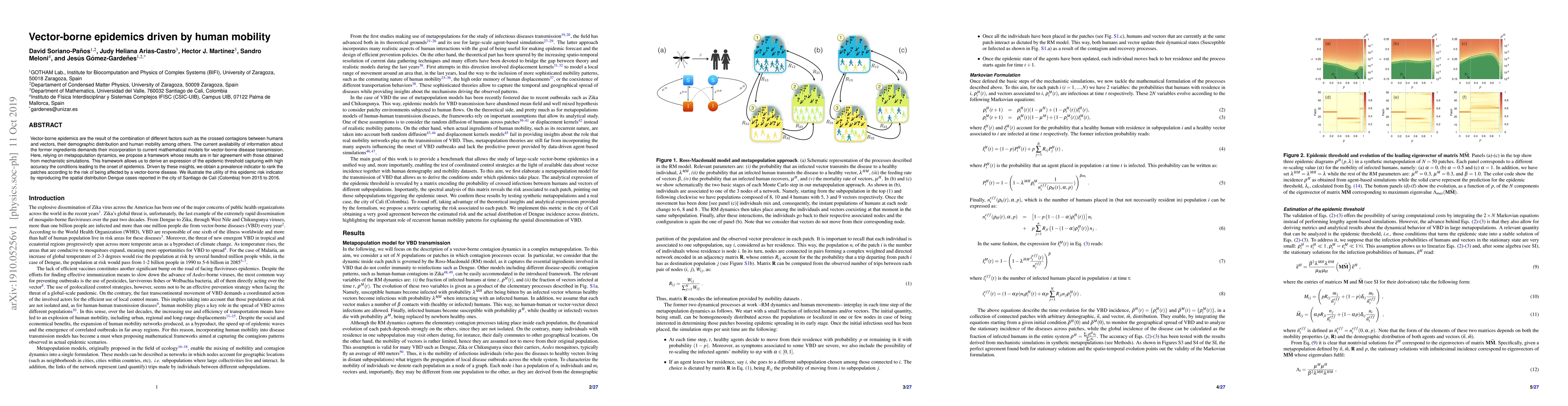 This paper proposes a metapopulation dynamics framework to model vector-borne epidemics, incorporating human mobility and demographic factors. The framework accurately predicts epidemic thresholds and identifies high-risk areas, demonstrated by its successful reproduction of the spatial distribution of Dengue cases in Santiago de Cali from 2015 to 2016.