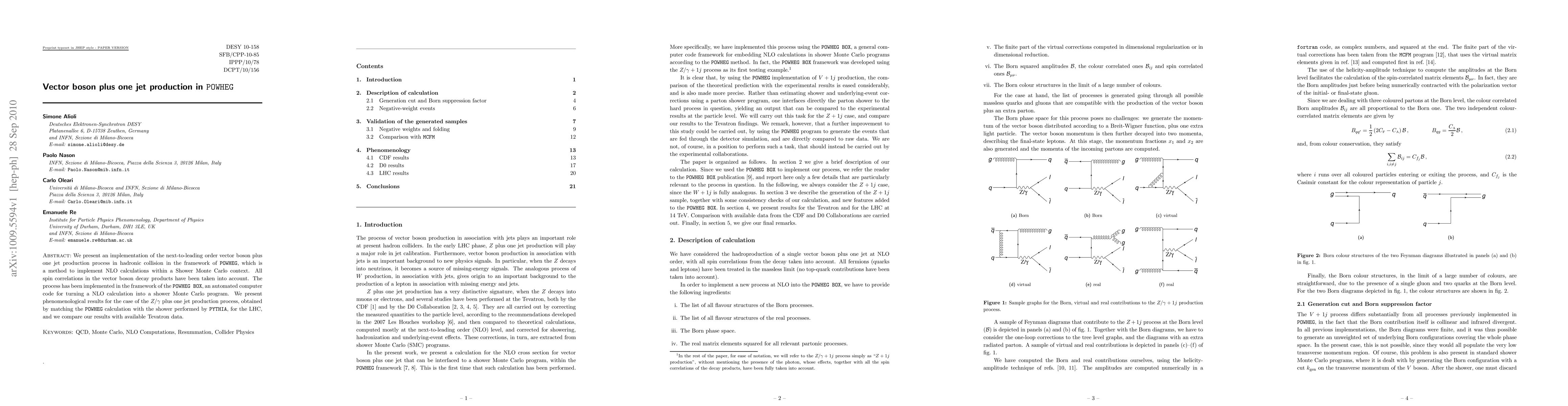 This paper details the implementation of next-to-leading order vector boson plus one jet production in POWHEG, a method for NLO calculations within a Shower Monte Carlo context. The study presents results for Z/gamma plus one jet production at the LHC, comparing them to Tevatron data.