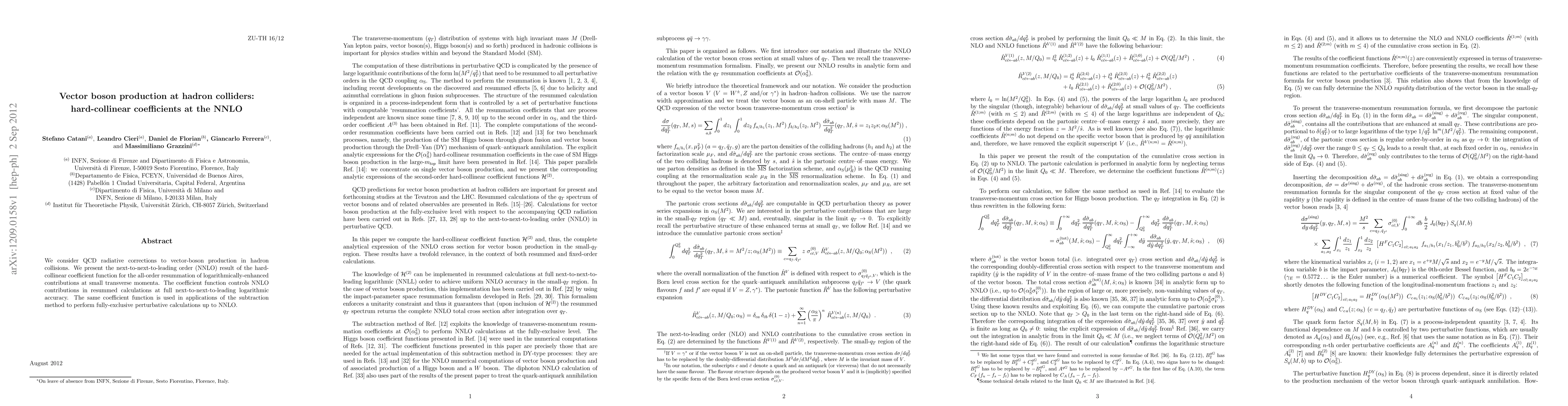 We consider QCD radiative corrections to vector-boson production in hadron collisions. We present the next-to-next-to-leading order (NNLO) result of the hard-collinear coefficient function for the all-order resummation of logarithmically-enhanced contributions at small transverse momenta. The coefficient function controls NNLO contributions in resummed calculations at full next-to-next-to-leading logarithmic accuracy. The same coefficient function is used in applications of the subtraction method to perform fully-exclusive perturbative calculations up to NNLO.