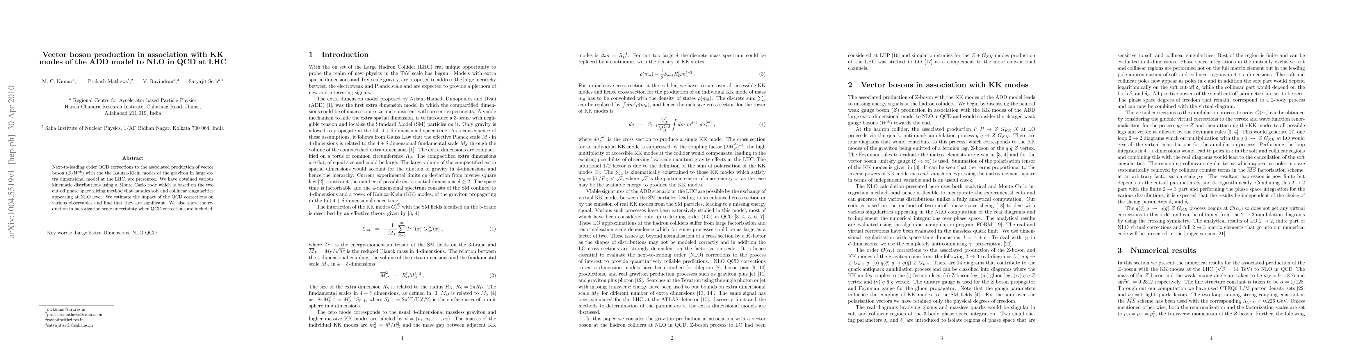 Next-to-leading order QCD corrections to the associated production of vector boson (Z/W) with the the Kaluza-Klein modes of the graviton in large extra dimensional model at the LHC, are presented. We have obtained various kinematic distributions using a Monte Carlo code which is based on the two cut off phase space slicing method that handles soft and collinear singularities appearing at NLO level. We estimate the impact of the QCD corrections on various observables and find that they are significant. We also show the reduction in factorization scale uncertainty when QCD corrections are included.