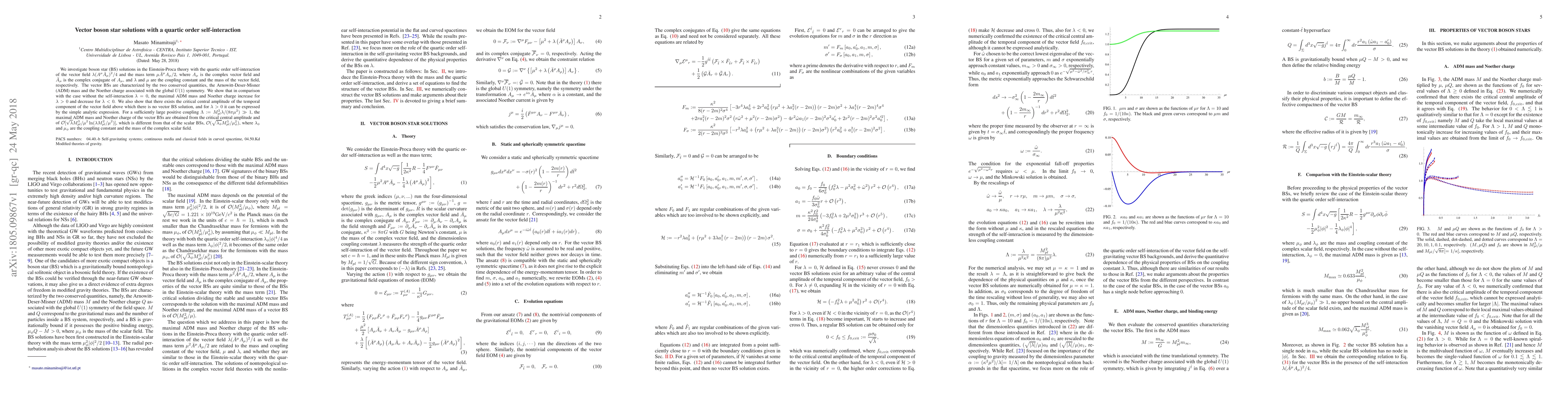 We investigate boson star (BS) solutions in the Einstein-Proca theory with the quartic order self-interaction of the vector field $\lambda (A^\mu\bar{A}_\mu)^2/4$ and the mass term $\mu \bar{A}^\mu A_\mu/2$, where $A_\mu$ is the complex vector field and ${\bar A}_\mu$ is the complex conjugate of $A_\mu$, and $\lambda$ and $\mu$ are the coupling constant and the mass of the vector field, respectively. The vector BSs are characterized by the two conserved quantities, the Arnowitt-Deser-Misner (ADM) mass and the Noether charge associated with the global $U(1)$ symmetry. We show that in comparison with the case without the self-interaction $\lambda=0$, the maximal ADM mass and Noether charge increase for $\lambda>0$ and decrease for $\lambda<0$. We also show that there exists the critical central amplitude of the temporal component of the vector field above which there is no vector BS solution, and for $\lambda>0$ it can be expressed by the simple analytic expression. For a sufficiently large positive coupling $\Lambda:=M_{pl}^2\lambda /(8\pi\mu^2) \gg 1$, the maximal ADM mass and Noether charge of the vector BSs are obtained from the critical central amplitude and of ${\cal O}[\sqrt{\lambda}M_{pl}^3/\mu^2 \ln (\lambda M_{pl}^2/\mu^2)]$, which is different from that of the scalar BSs, ${\cal O}(\sqrt{\lambda_\phi}M_{pl}^3/\mu_\phi^2)$, where $\lambda_\phi$ and $\mu_\phi$ are the coupling constant and the mass of the complex scalar field.