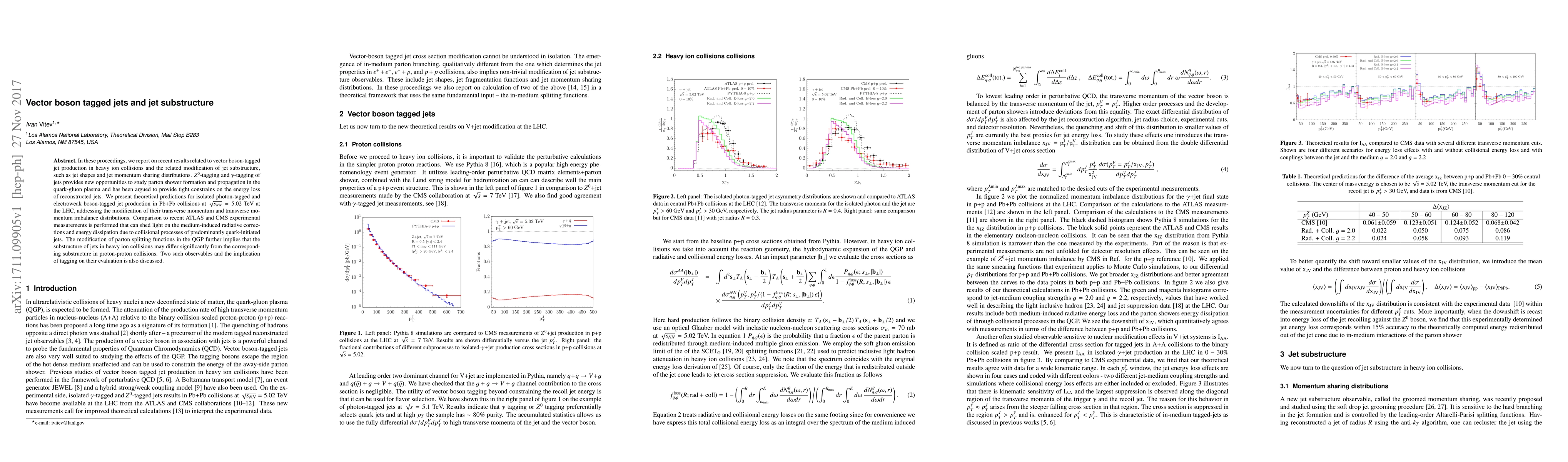 In these proceedings, we report on recent results related to vector boson-tagged jet production in heavy ion collisions and the related modification of jet substructure, such as jet shapes and jet momentum sharing distributions. $Z^0$-tagging and $\gamma$-tagging of jets provides new opportunities to study parton shower formation and propagation in the quark-gluon plasma and has been argued to provide tight constrains on the energy loss of reconstructed jets. We present theoretical predictions for isolated photon-tagged and electroweak boson-tagged jet production in Pb+Pb collisions at $\sqrt{s_{NN}} = 5.02$ TeV at the LHC, addressing the modification of their transverse momentum and transverse momentum imbalance distributions. Comparison to recent ATLAS and CMS experimental measurements is performed that can shed light on the medium-induced radiative corrections and energy dissipation due to collisional processes of predominantly quark-initiated jets. The modification of parton splitting functions in the QGP further implies that the substructure of jets in heavy ion collisions may differ significantly from the corresponding substructure in proton-proton collisions. Two such observables and the implication of tagging on their evaluation is also discussed.
